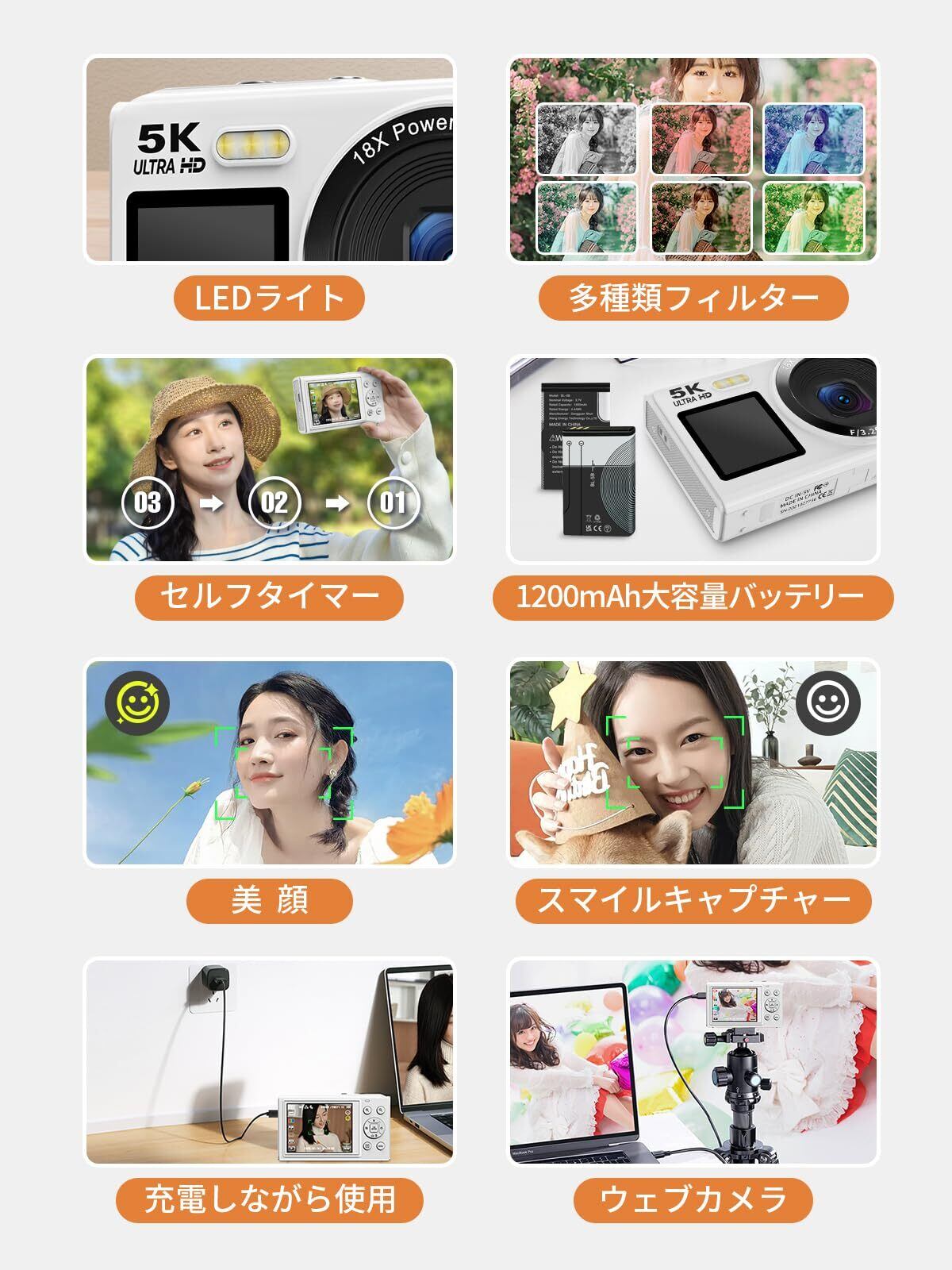 AiMike 5K デジカメ スマホに送れる デジタルカメラ WIFI転送機能 8000万画素 デュアルスクリーン 64GBマイクロSDカード付き 18倍デジタルズーム オートフォーカス機能 ウェブカメラ 19種類フィルター 自撮り便利 バッテリー2枚 コンパクト 子供や初心者向け 子供の日 クリスマスプレゼント ホワイト