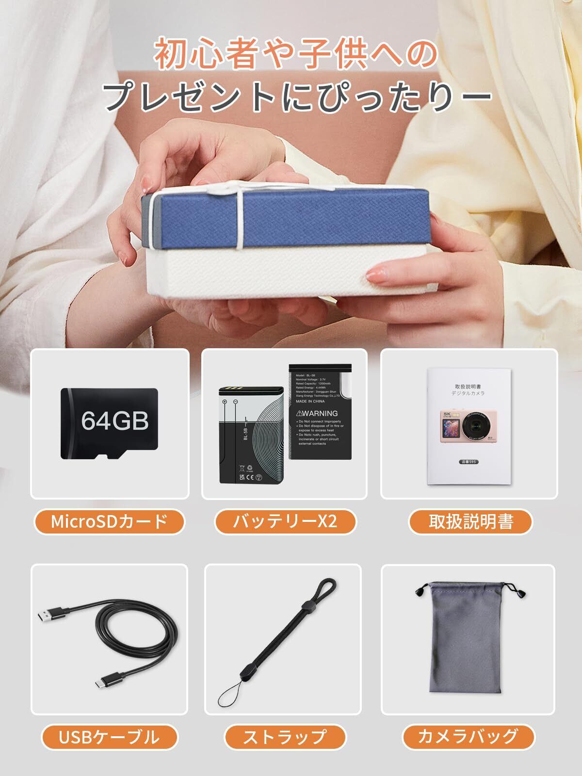 【64GBMicroSDカード&バッテリー2枚付き】1200mAh大容量バッテリーが2つ付属していて、外出先でもバッテリーの残量を気にする必要がなく、長時間撮影が可能です。充電しながら使用できますので、運動会、発表会、セミナー、コンサートで遠くの被写体を撮影する時など、長時間の撮影に最適です。また、本製品には64GBMicroSDカードも付属しておりますので、到着次第にすぐに使えます。本製品は最大256GBのMicro SDカードに対応していますことをご注意ください。【セット内容】1×デジタルカメラ、1×64GBMicroSDカード、1×USBケーブル、1×日本語取扱説明書、2×バッテリー。本体重量はわずか114g(バッテリー含み)と非常に軽量で、女性や学生でも長時間使用できる、コストパフォーマンスの高いデジタルカメラです。家族写真、運動会、忘年会、卒業式、旅行、イベントなど、さまざまな場面でお使いいただけます。