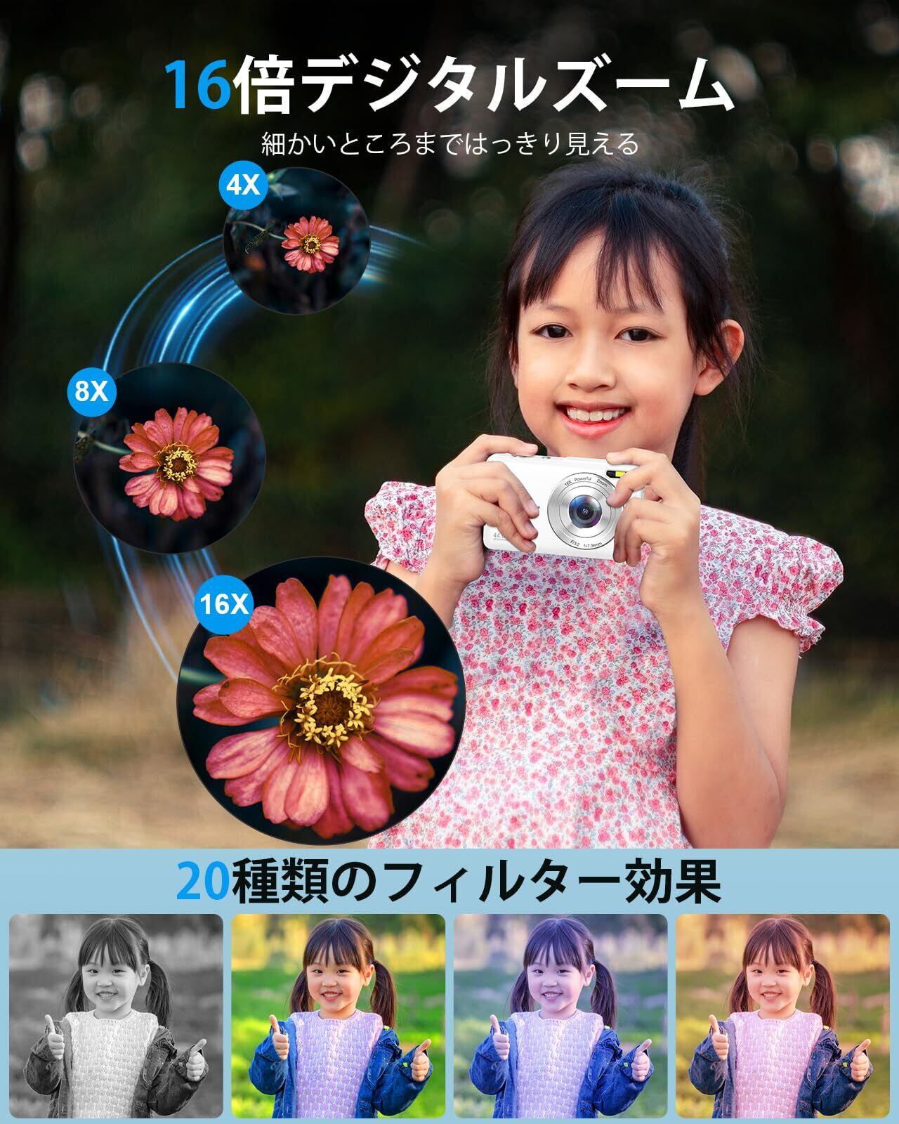 【パワフルなコンデジ】16倍デジタルズームを搭載しており、遠く離れた被写体でもキレイに撮影可能です。その上、手ぶれ補正、ウェブカメラ、顔検出、微笑検出、連続撮影、セルフタイマー20種類のフィルター効果、ウェブカメラ機能、ビデオの一時停止をを備えています。お子様の撮影能力にはもちるん、集中力·知育成長·色彩感党にも役に立ちます。知育道具として親子で使うのが大活躍。