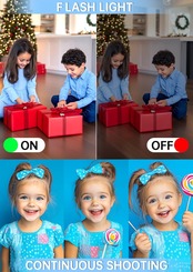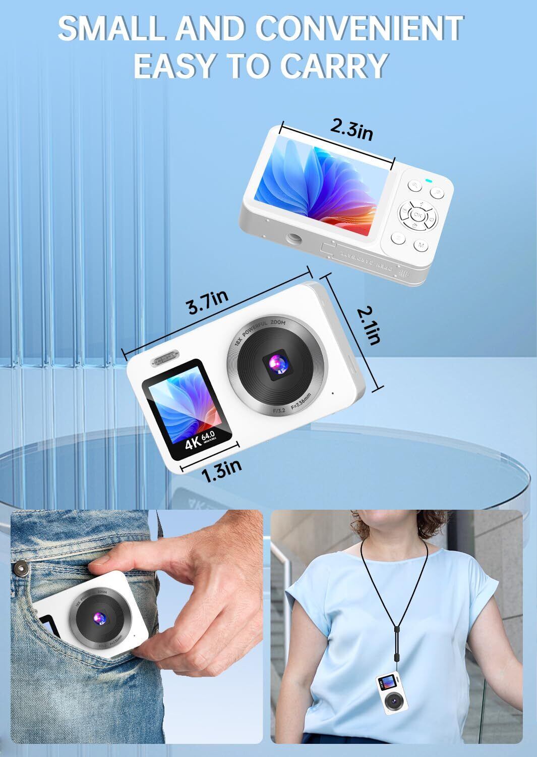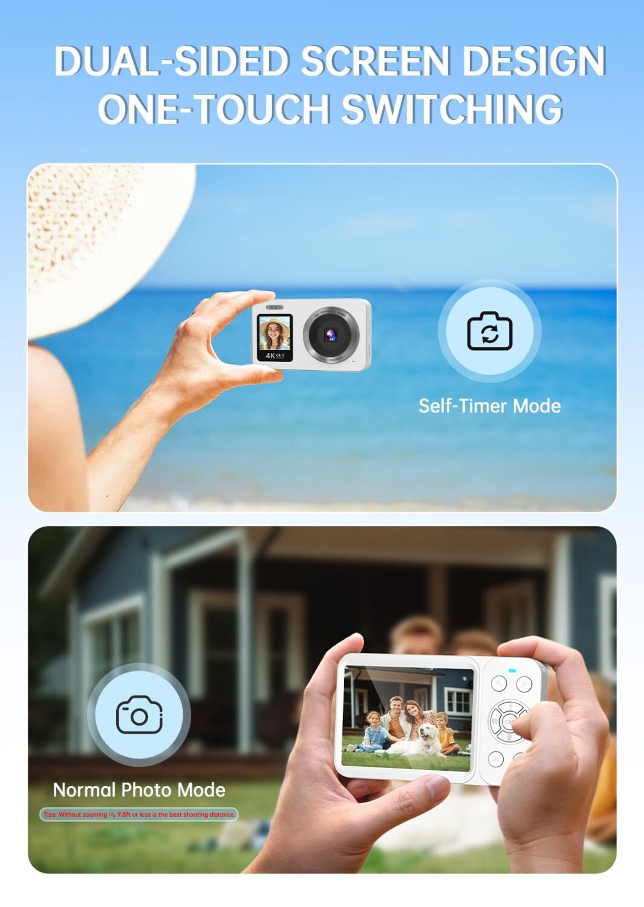 【4K 64MP & デュアルスクリーンデザイン】デュアルスクリーン搭載の4K 64MPデジタルカメラで、すべての瞬間を美しく残せます!本体を回転させることなく、ワンタッチでセルフィーモードに切り替え可能。レトロなフィルム風グレインエフェクトで、映画のような雰囲気のある写真が撮影できます。最適な撮影距離は約2.5m(8ft)で、明るい環境での撮影を推奨します。