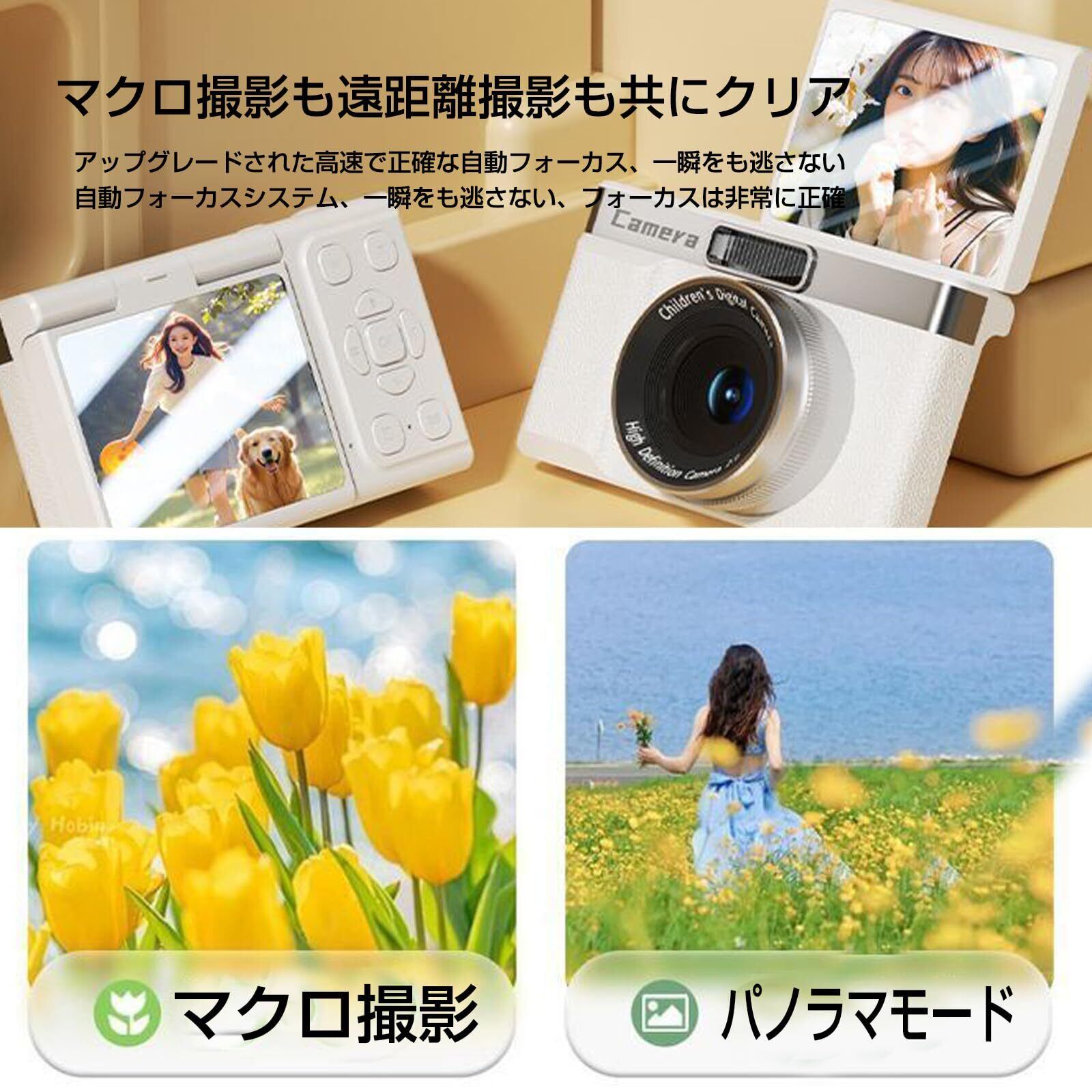 コンパクトで持ち運び便利 小型軽量のボディながら、2.8インチの大型液晶モニターを備えています。持ち運びが便利で、どこでもすぐに撮影を楽しめます。クリスマスや誕生日などの特別な日に、友人や家族へのプレゼントにも最適なデジカメです。翻盖デザインは携帯性を損なわず、コンパクトなままで魅力的です。
