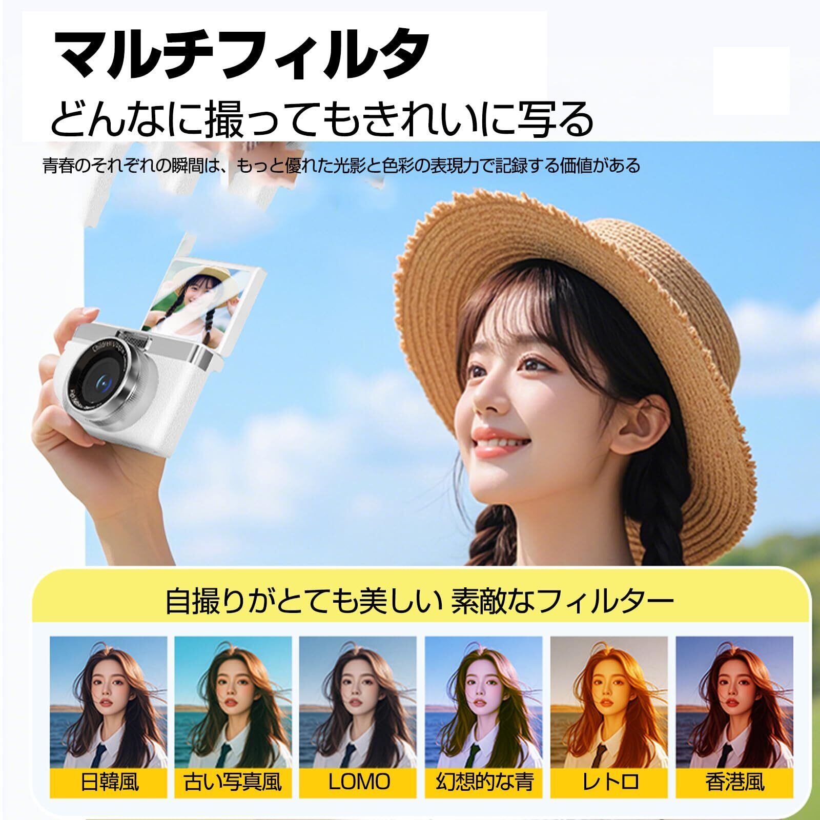 多彩な撮影機能 内蔵フィルライトがあり、暗い場所でも撮影が可能です。自撮り、連続撮影、セルフタイマー、一時停止などの機能に加え、手振れ補正、美顔機能、多種類のフィルター、ウェブカメラ機能なども搭載されています。このデジカメでは、様々な撮影シーンに対応でき、翻盖のデザインが撮影の創造性をさらに広げます。