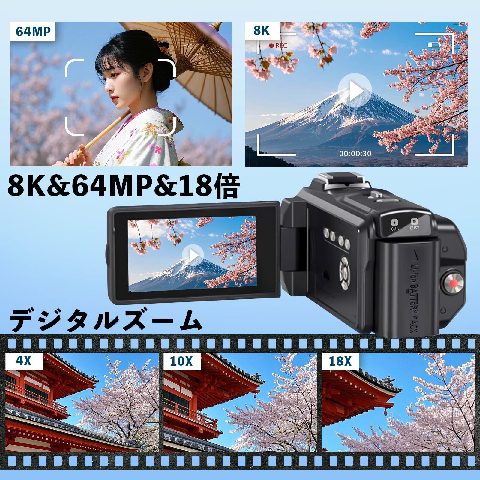 ■【8K映像で驚きの画質を実現!】このビデオカメラは、6400万画素の高解像度写真と最大8Kの動画撮影が可能。3インチのタッチモニター搭載で、操作が直感的に行え、リアルタイムで高精細な映像を確認しながら記録できます。特別な瞬間を美しく捉えるための最適なパートナーです。