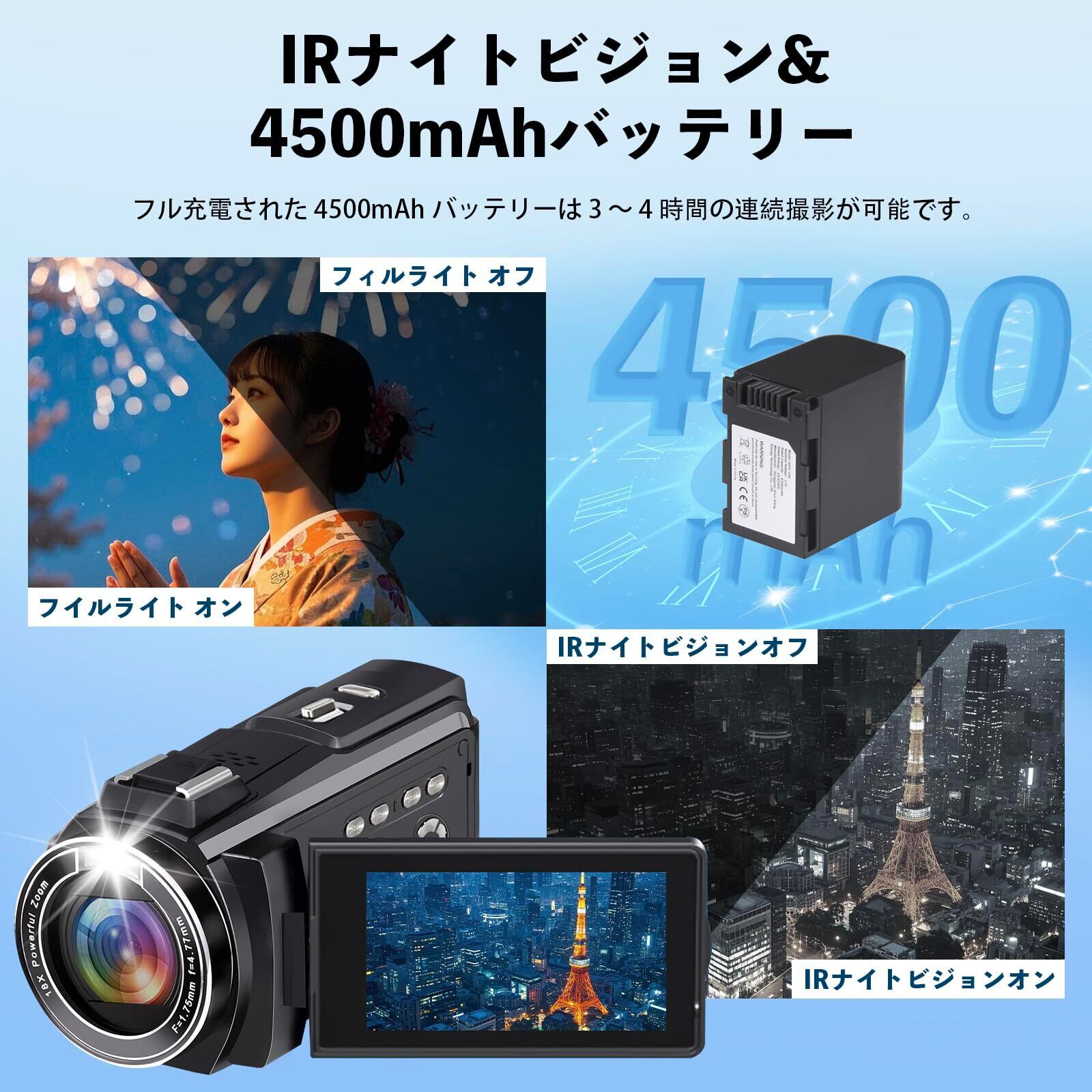 【赤外線ナイトビジョン & 4500mAhバッテリー&8Kビデオカメラで学ぼう】 ビデオカメラの基本機能はすべて内蔵されていますので、練習機として最適です。IRナイトビジョン付き、暗い環境でも鮮明に記録できます。基本的な機能以外に、色モード変換、定時撮影、一時停止機能、ループ撮影のような専門機能も内蔵、簡単な編集でプロっぽい作品が出来上がります。大容量4500mAhの着脱式リチウムバッテリーを搭載し、長時間の撮影に最適します。アウトドアやスポーツイベントなど、電源を気にせず使用できます。