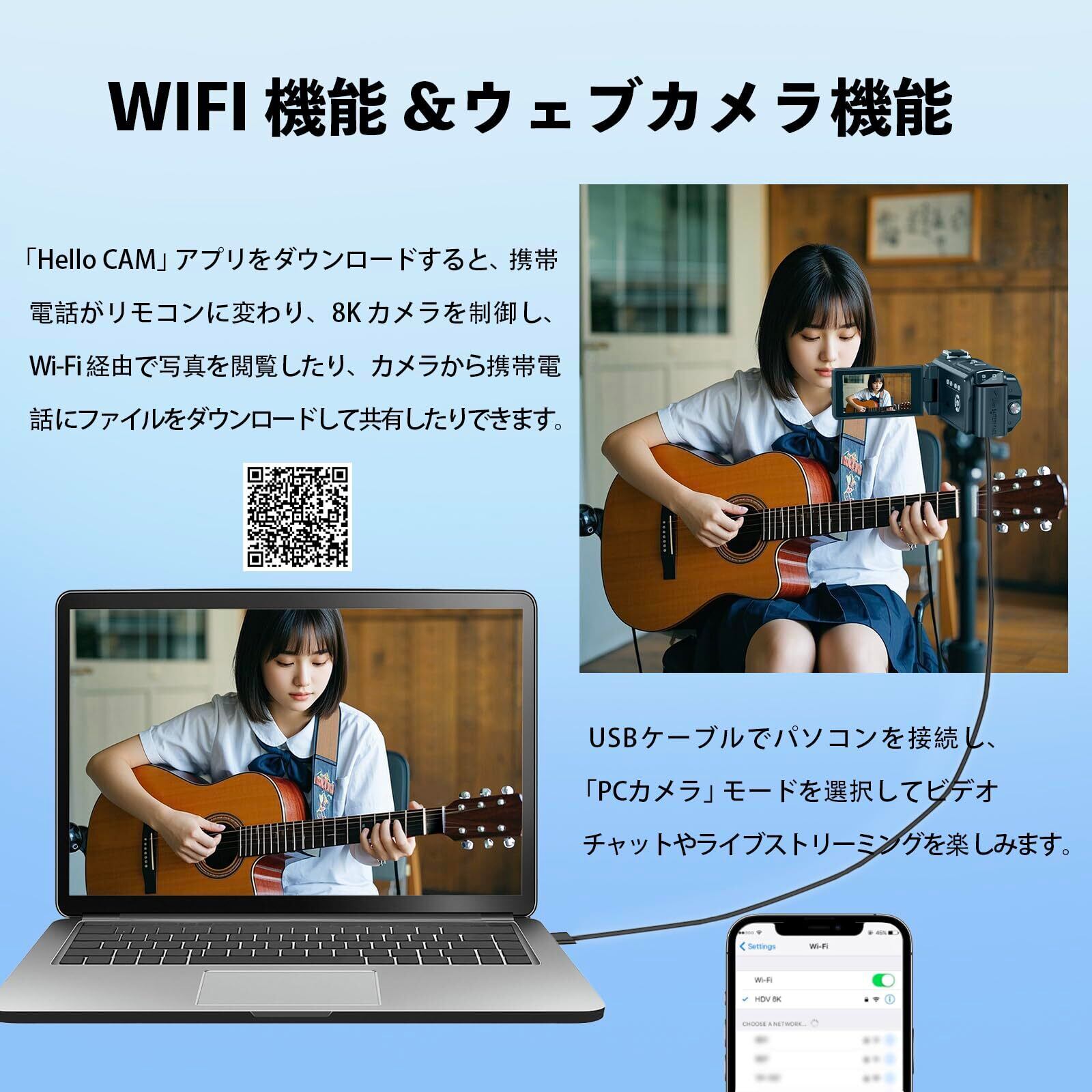 【ウェブカメラ機能 & Wi-Fi機能&8Kビデオカメラでシェアしよう】 YouTube、Skype、TikTok、Facebookなどのライブ配信やビデオ通話にウェブカメラとしても使用可能です。Wifi機能でスマホやタブレットと連携できるので、本体から離れた場所から、携帯に動画送れますし、本体を制御したり画像チェックができます。面倒な設定も少なく、操作も簡単です。Wifi機能の具体的な操作方法は取り扱い説明書を参照してください。旅行やイベントの思い出を簡単に家族や友人とシェアできます。
