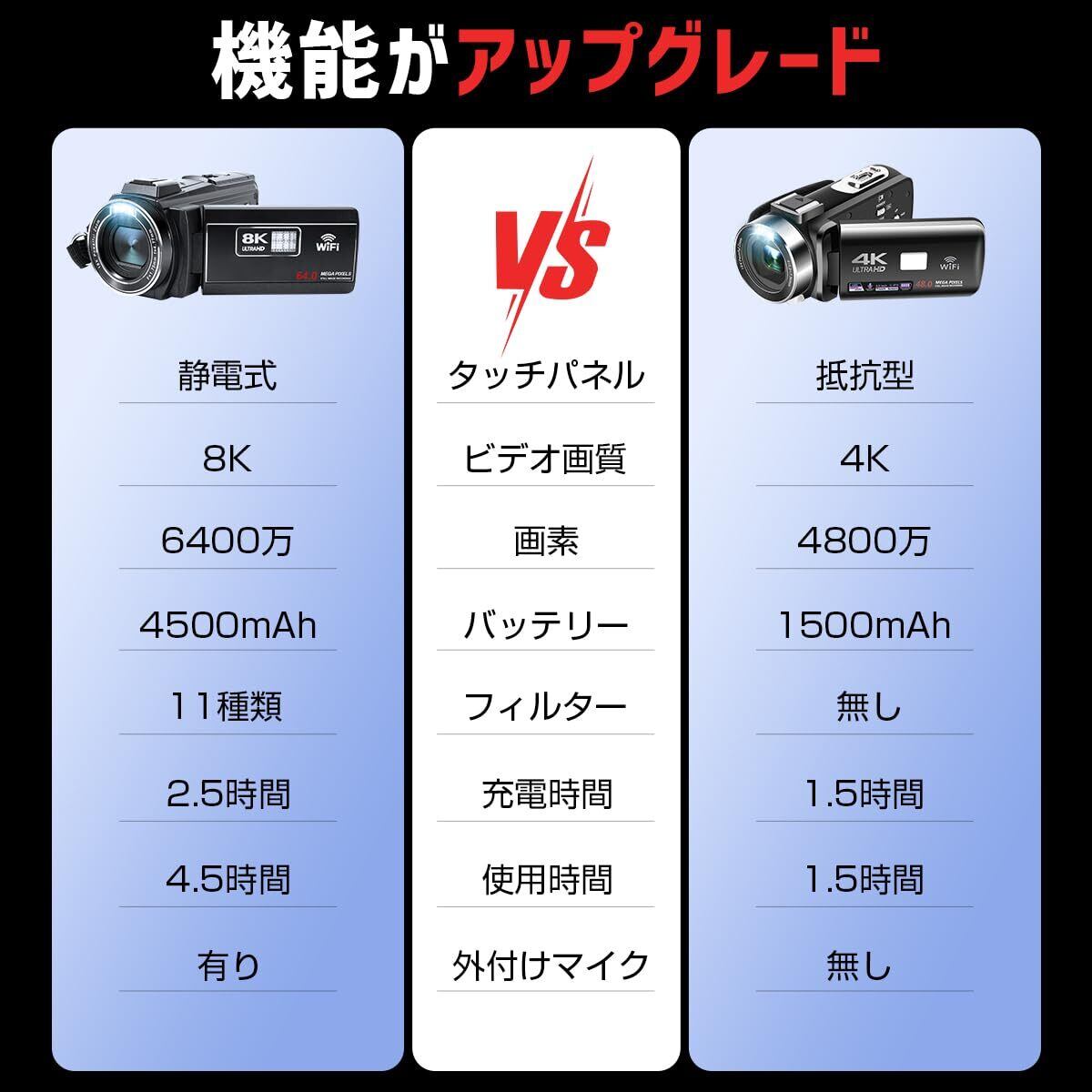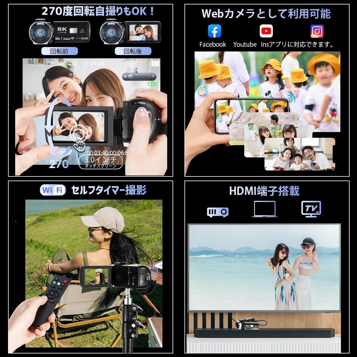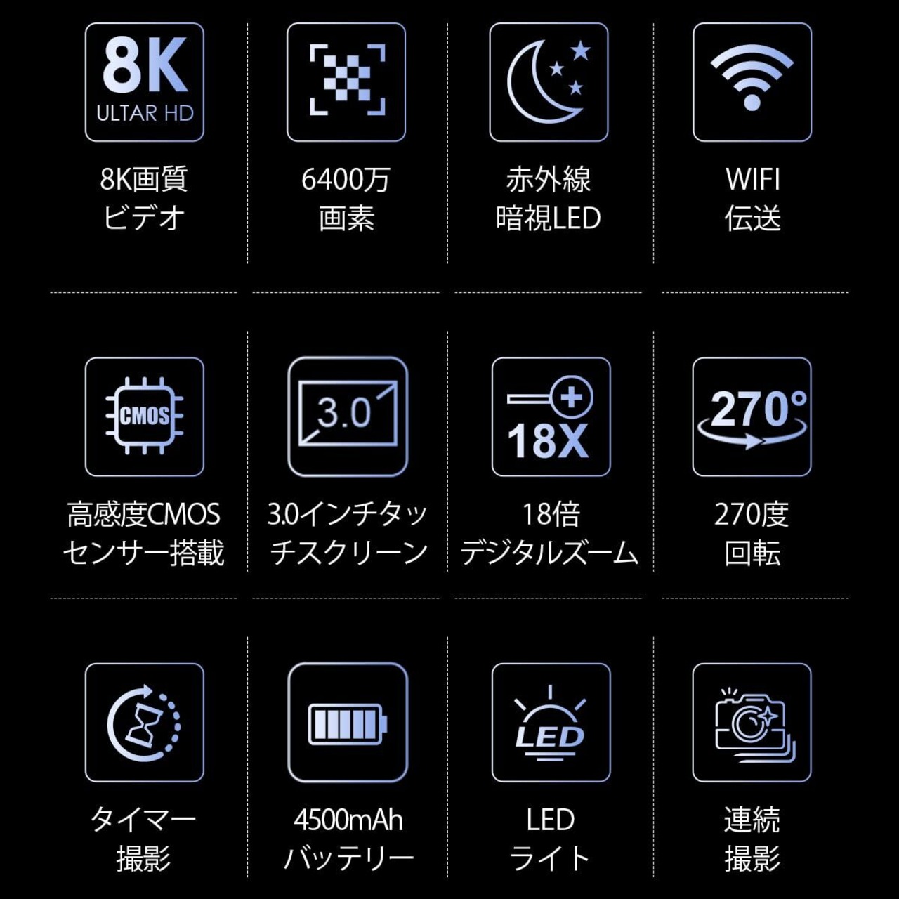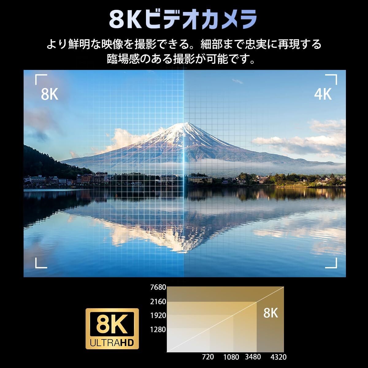 【WIFI機能&外付けマイク&8Kビデオカメラ】Wifi機能でスマホやタブレットと連携できるので、本体から携帯に動画送れますし、本体を制御したり画像チェックができます。操作も簡単です。外付けマイクが搭載され、騒音を有効に抑え、会議、座談会、メディアインタビュー、講演、映画などにクリアに音を採集します。 付属のTYPE-Cケーブルでカメラをコンピューターに接続すると、ウェブカメラとして利用可能で、Facebook、YouTube、Instagramに最適です。自分の考えをシェアしたい場合、離れた家族と会いたい場合、ご協力させましょう。日本語取扱説明書同梱、タッチパネル付き、2.4Gリモコンでも本体でも直感的に簡単操作。充電しながら使用可能、さらに、お手持ちのモバイルチャージャーからも充電が出来るので、お宅でもお出かけ時でも安心です。