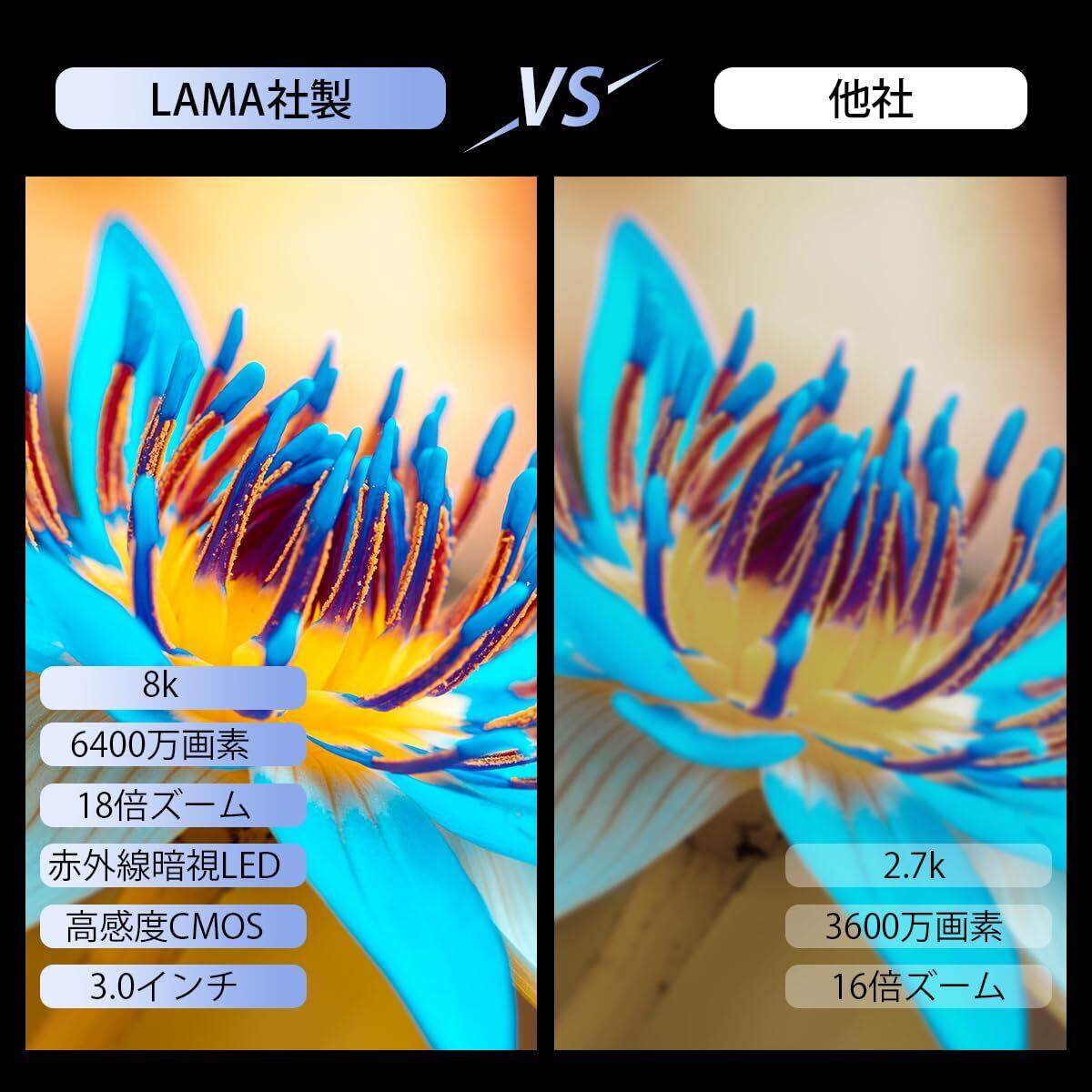 ■【6400万画素で美しい映像をキャッチ!】LAMA ビデオカメラは、6400万画素の高解像度で、細部までリアルな映像を捉えます。最高の画質で、思い出や特別な瞬間を美しく記録し、Vlogや旅行、イベントの撮影に最適です。
