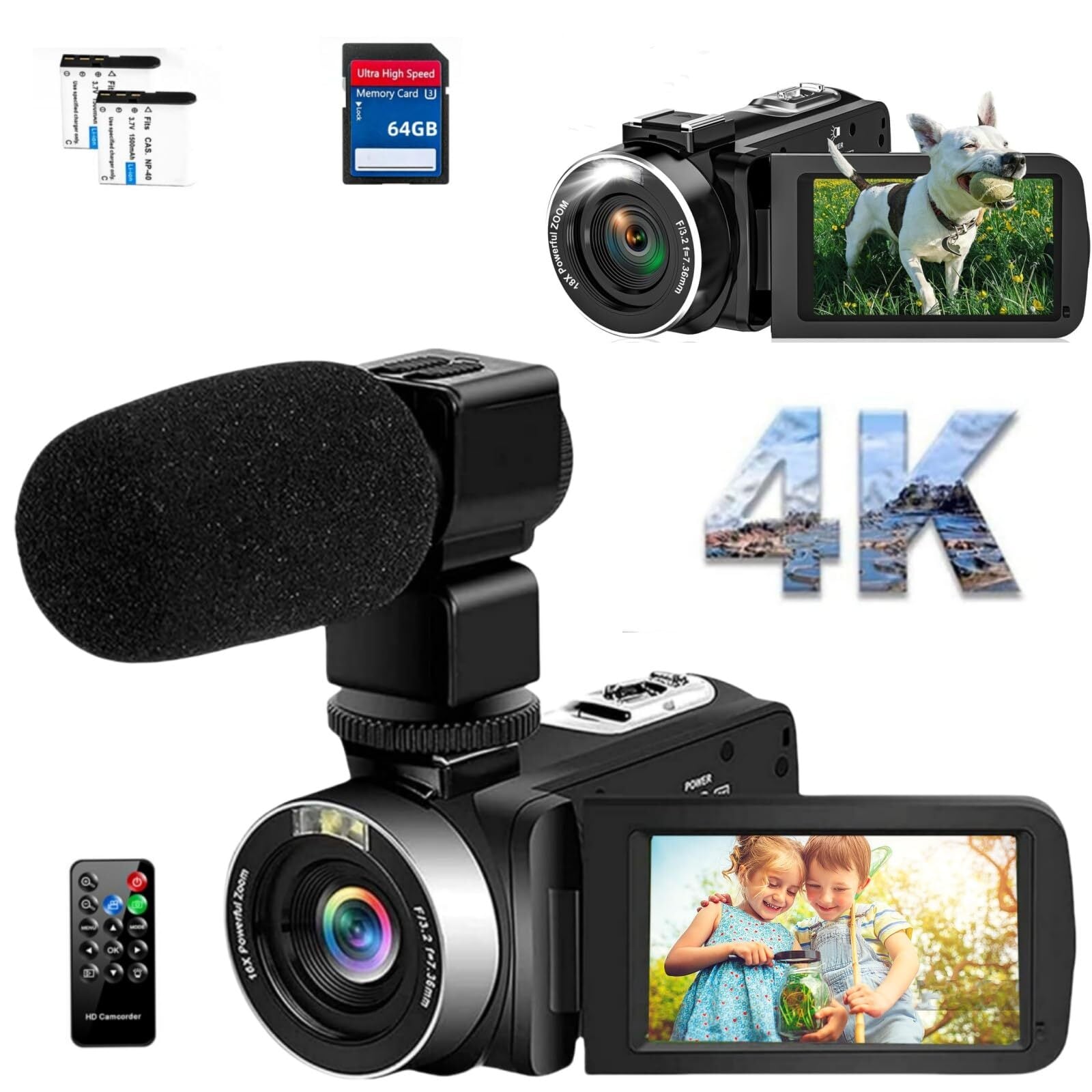 ビデオカメラ 4K 75MP 30FPS18Xデジタルズーム 外付けマイク付属LEDフィルライト機能 3.0インチ LCDスクリーン Vlogカメラ YouTube用ウェブカメラ一時停止機能 リモコン付き バッテリー2個64GBのSDカード付属日本語取扱説明書7500万画素数