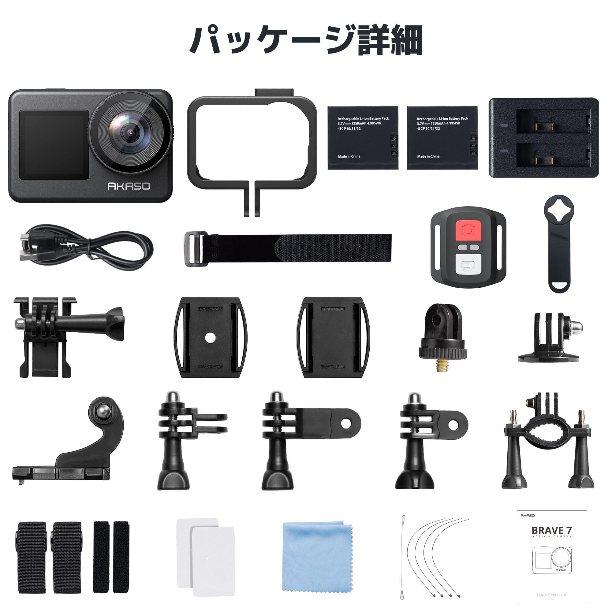 【豊富なアクセサリー】AKASO Brave7 アクションカムは1350mAhバッテリー2個と各種のアクセサリーが付属して、アウトドア撮影としては十分になります。ヘルメット、自撮り棒や車に取り付け、いろんなシーンで活用することが可能です。※ご注意ください:AKASO Brave7 アップグレードバージョンを購入された場合は、公式サイトのマニュアル「19D」を参照してください。