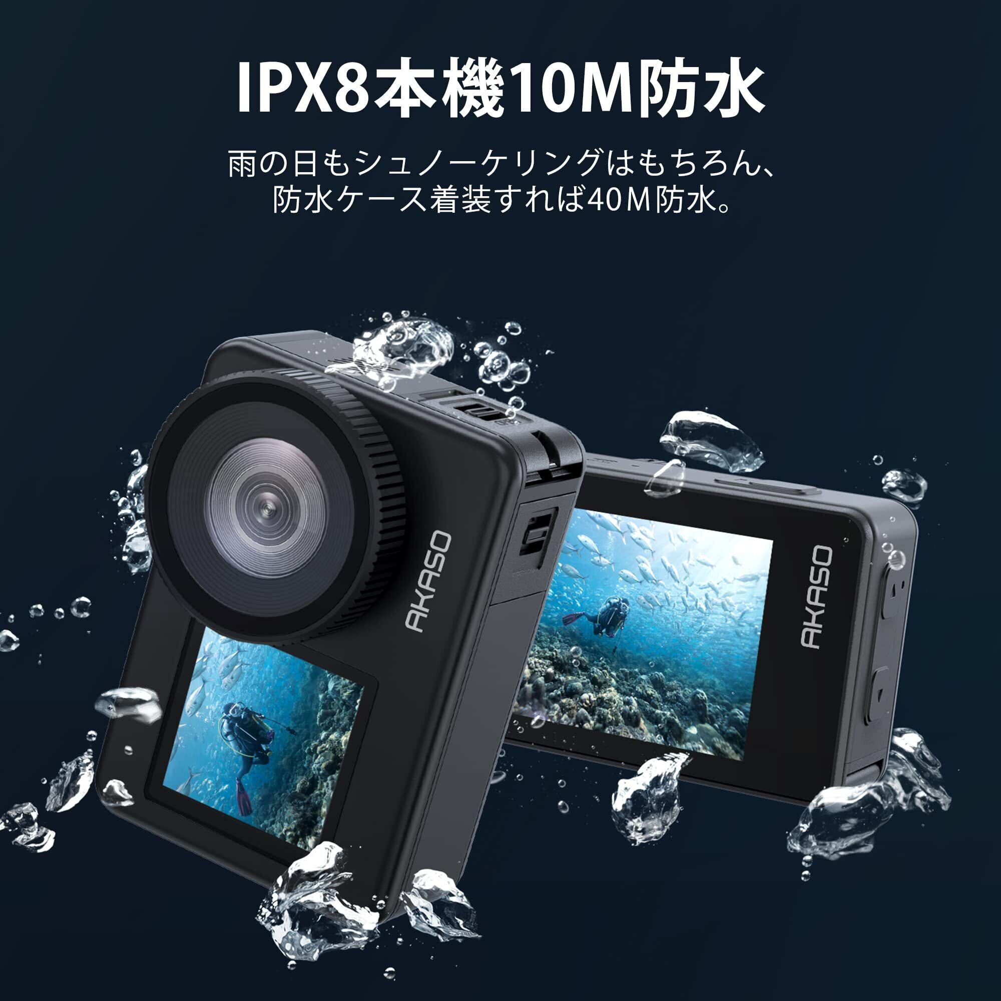 【本機防水アクションカメラBrave 7】AKASO Brave 7アクションカメラは、IPX8防水性能があり、雨、雪、水しぶきからカメラを保護可能、どんな天候でも使用でき美しさを保存されます。本機防水10Mで防水ケースを装着しなくても楽に撮影することができます。メモ:実際の防水深さは使用方式によって差があります。また、防水ケース(別売り)を装着すると、最大40M防水可能になります。