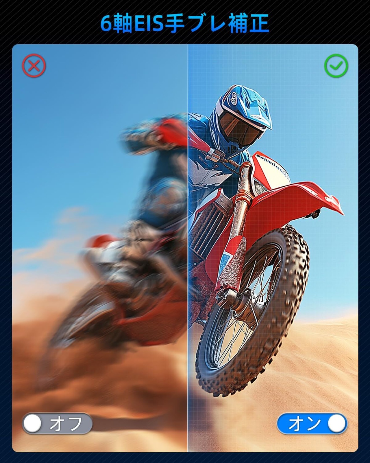 ■【6軸手ぶれ補正で安定した映像を!】先進の6軸手ぶれ補正技術が、振動や揺れを効果的に抑え、滑らかな映像を実現します。自転車や登山、スキーなど、アクティブなシーンでも安心して撮影できます。
