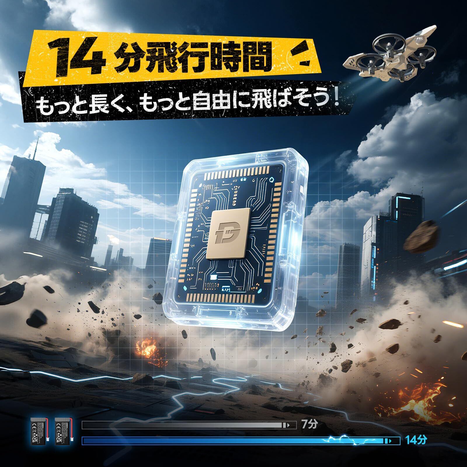 ■【バッテリー2個で長時間飛行!】このドローンには2個のバッテリーが付属しており、合計で14分の飛行が可能です。バッテリー切れを気にせず、たっぷり遊べるのが魅力です。バッテリー交換も簡単で、もっと遊びたい時にすぐに対応できます。