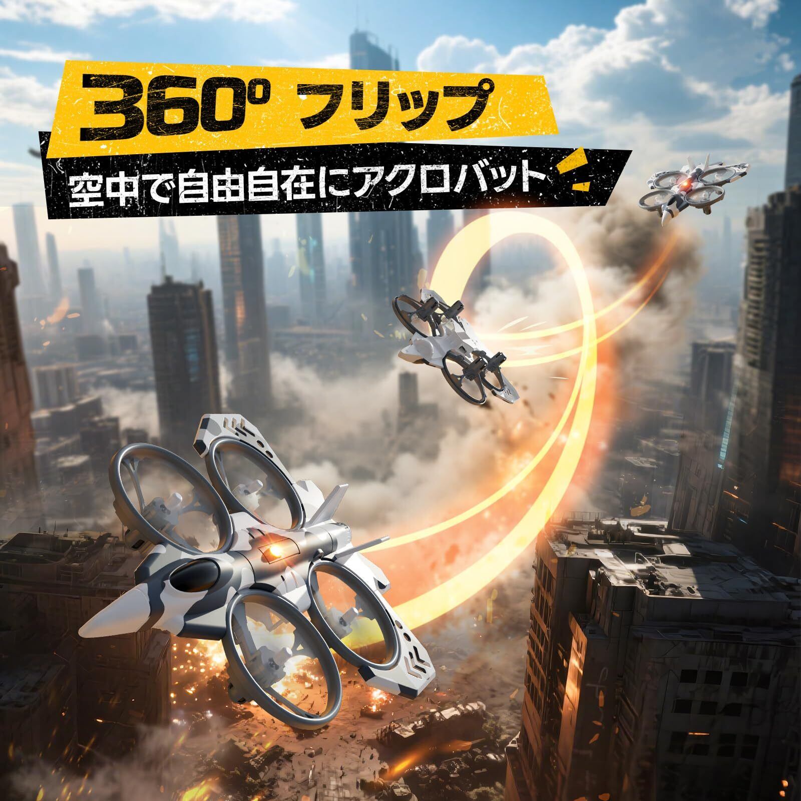 【3段階スピード調整&360°回転フリップ】スキルに合わせて速度を3段階で調節可能。360°エアロバティックフリップ機能で自由自在の動きを実現し、多彩な飛行スタイルをお楽しみいただけます。