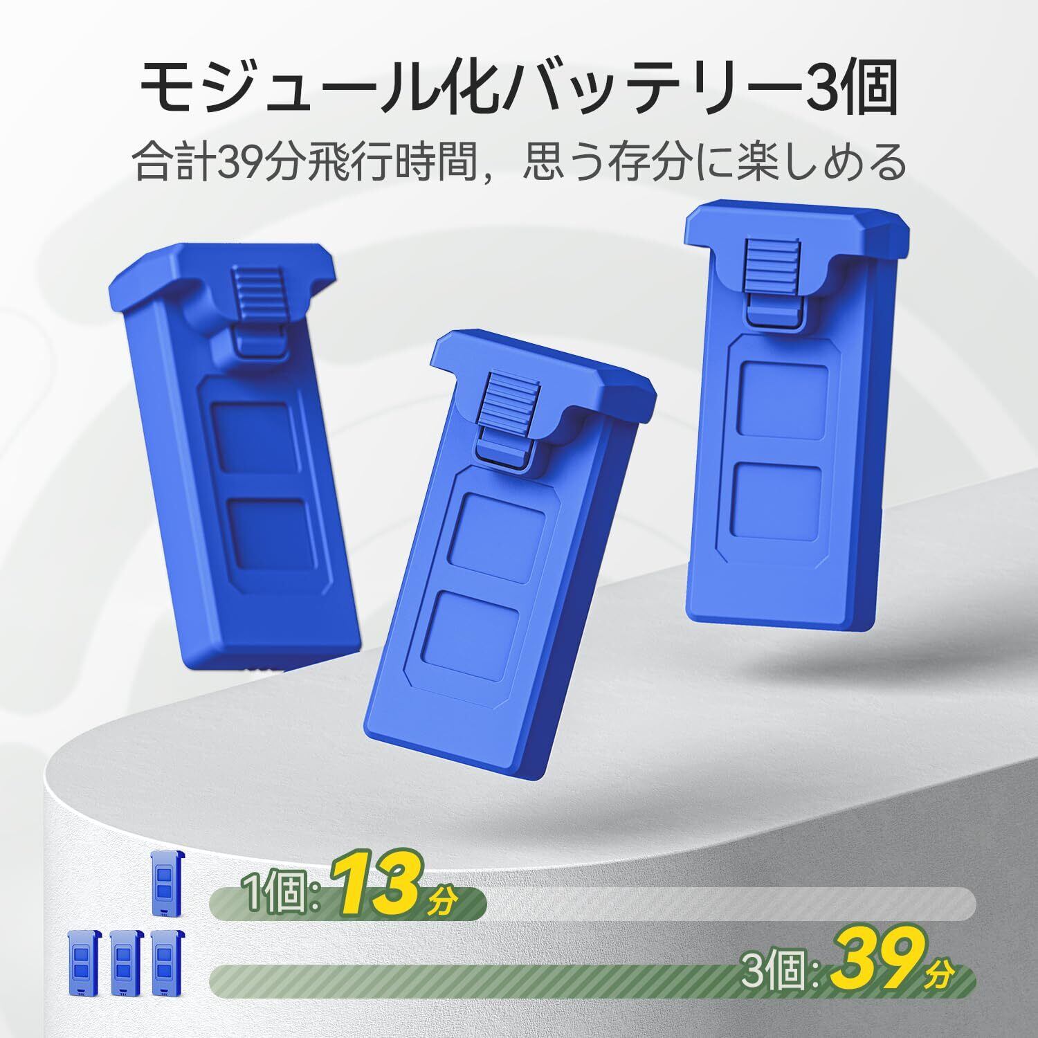 ■【長時間フライトを実現するバッテリー】このドローンには3つのバッテリーが付属し、最大で39分間の飛行が可能です。バッテリー交換も簡単で、長時間にわたって空中を楽しむことができます。充実のフライト時間をぜひお楽しみください!