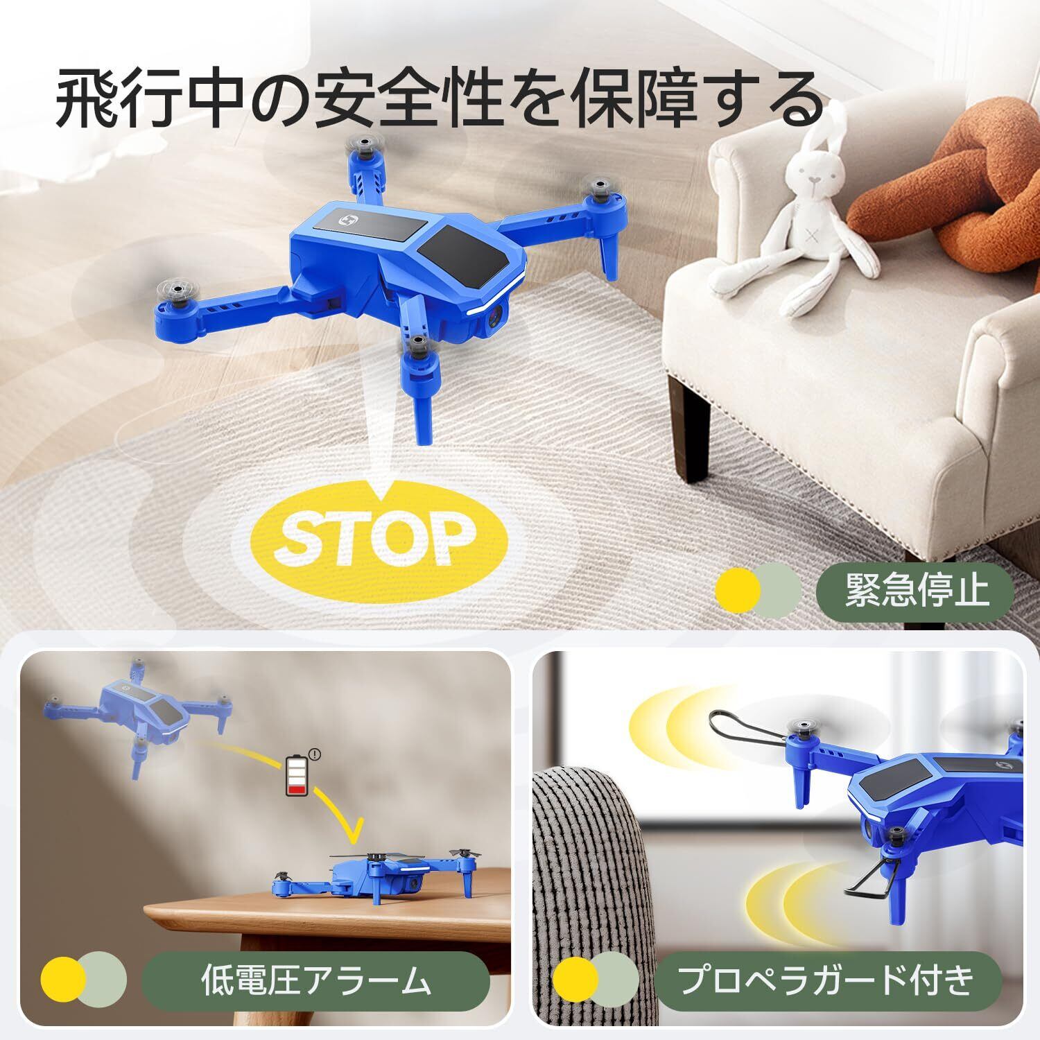 【安心感を与えるドローン】プロペラガードを4枚付き、緊急停止、低電圧アラーム機能も搭載され、ドローン練習中の安全面、安定性を配慮しました。