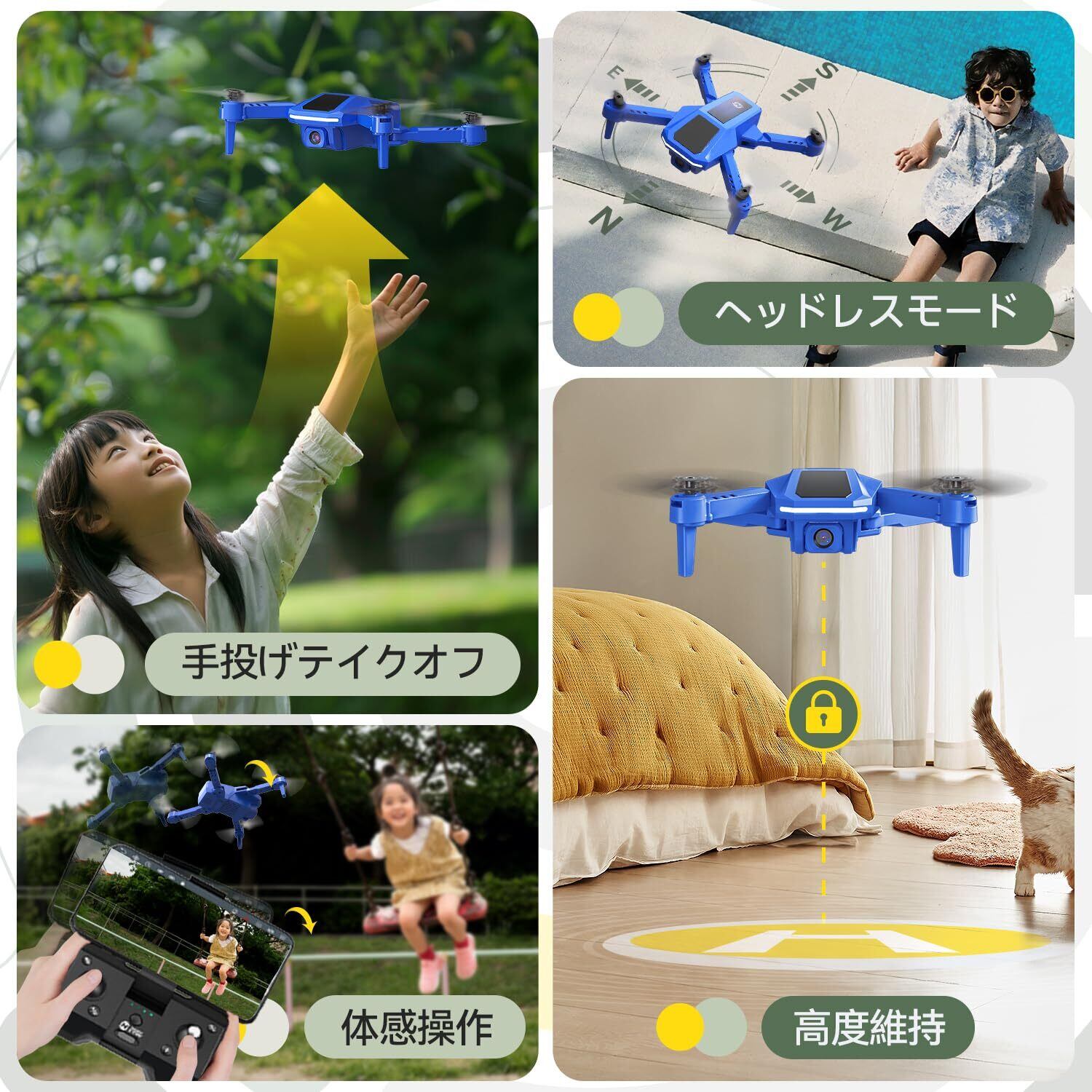 【初心者に優しいドローン】手投げテイクオフ、高度維持、ヘッドレスモード、体感操作、操縦モード1/2切替など、初心者でも楽しめるように考えられた便利な機能を備えています。ドローン操縦に慣れていなくてもそれらの機能で上手く練習できます。