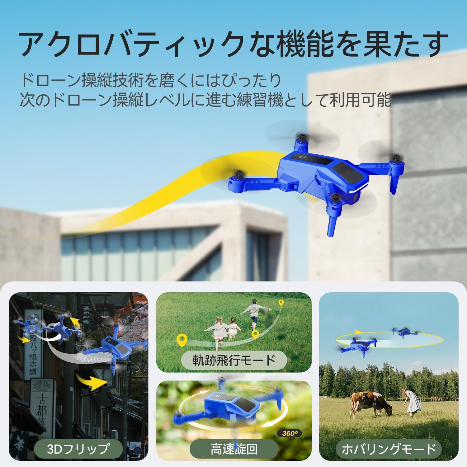 【アクロバティックな機能を果たす】ドローン操縦入門レベルを超え、次の操縦レベルに進もうとしたら、360°宙返り、高速旋回、軌跡飛行モード、ホバリングモードなど、よりドローンを楽しむためのさまざまな機能も果たせる当製品は最適です。それらのアクロバティックな機能で操縦技術を練習しながら、ドローンの新たな利用場面も見つけましょう!