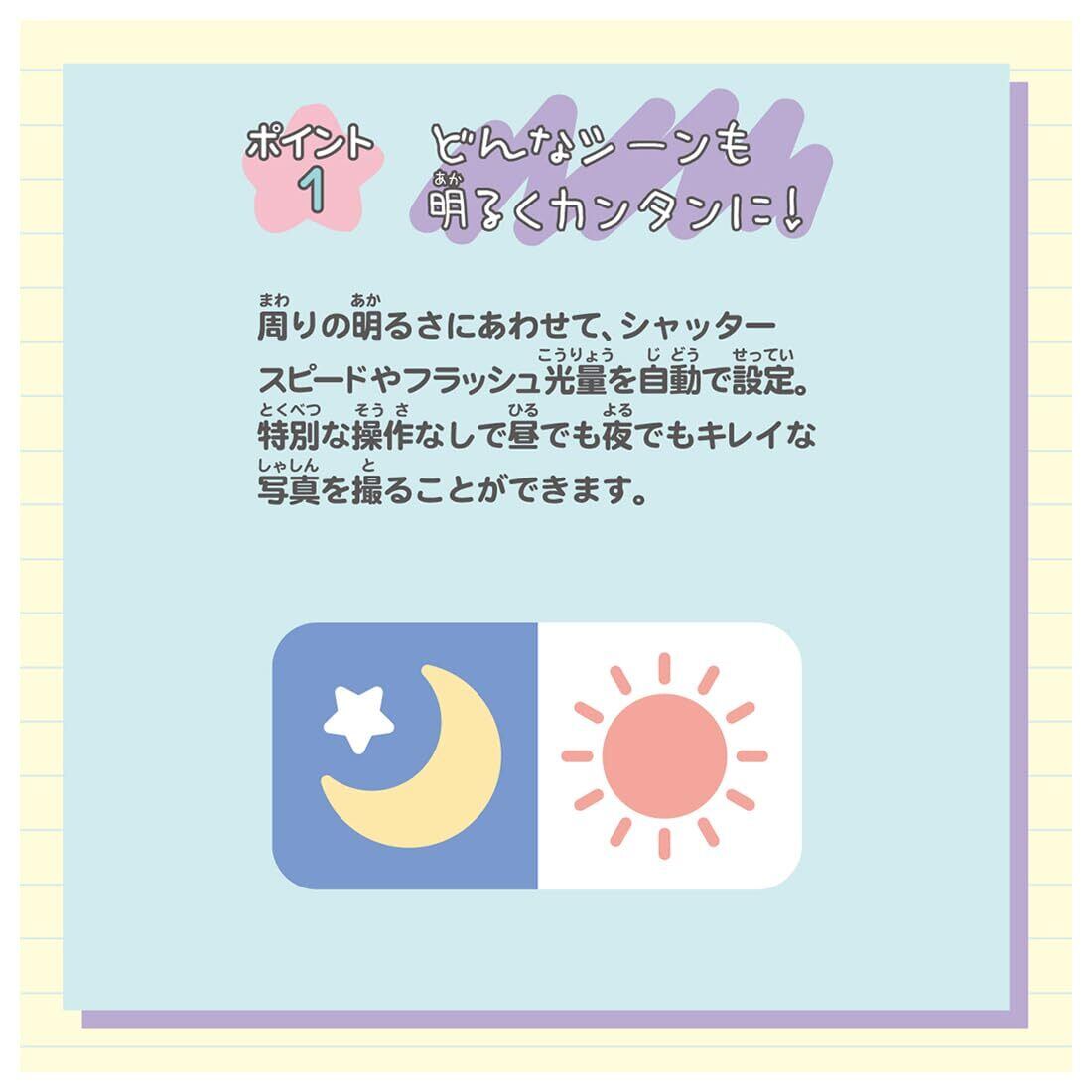 周りの明るさにあわせて、シャッタースピードやフラッシュ光量を自動で設定。特別な操作なしで昼でも夜でもキレイな写真を撮ることができます。