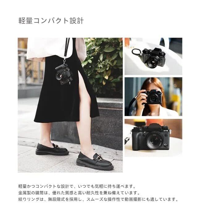 [軽量コンパクト設計] 軽量かつコンパクトな設計で、いつでも気軽に持ち運べます。金属製の鏡筒は、優れた質感と高い耐久性を兼ね備えています。絞りリングは、無段階式を採用し、スムーズな操作性で動画撮影にも適しています。