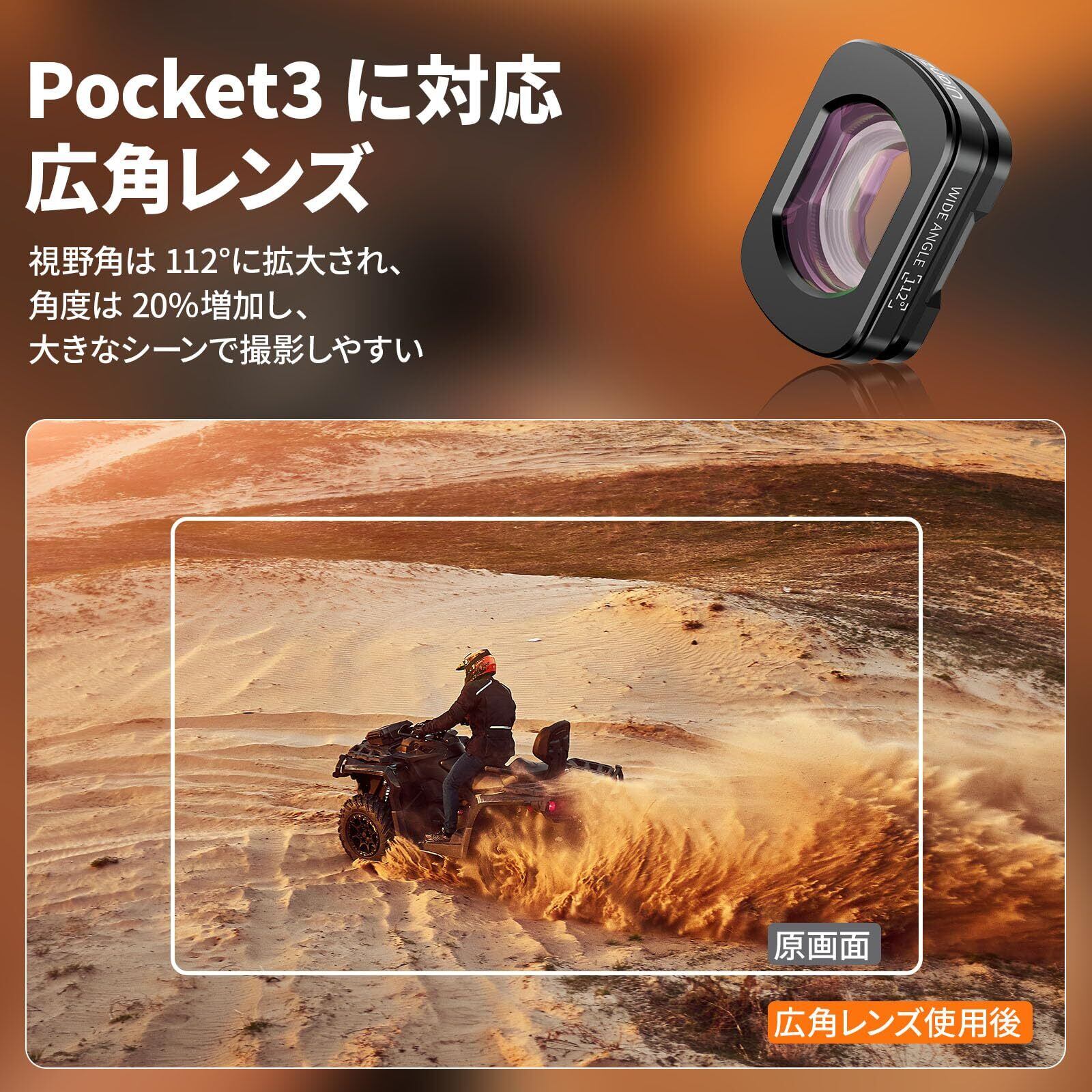 【広角画面】広角レンズをPocket3に装着して使用すると、視野角は112°に拡大され、角度は20%増加し、より広い画角で撮影できます。写真をより魅力的にします。*レンズの歪みの程度は-24°です。
