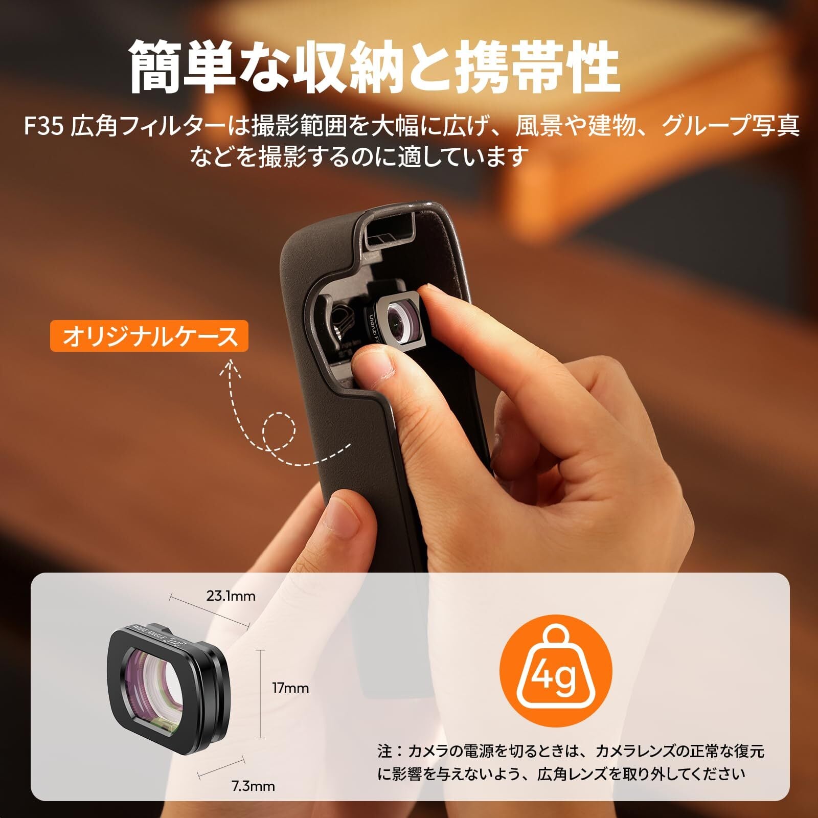 【簡単な収納と携帯性】オリジナル保護ケース上部のレンズスロットにフィットし、簡単に収納できます注:カメラの電源を切るときは、カメラレンズの正常な復元に影響を与えないよう、広角レンズを取り外してください。