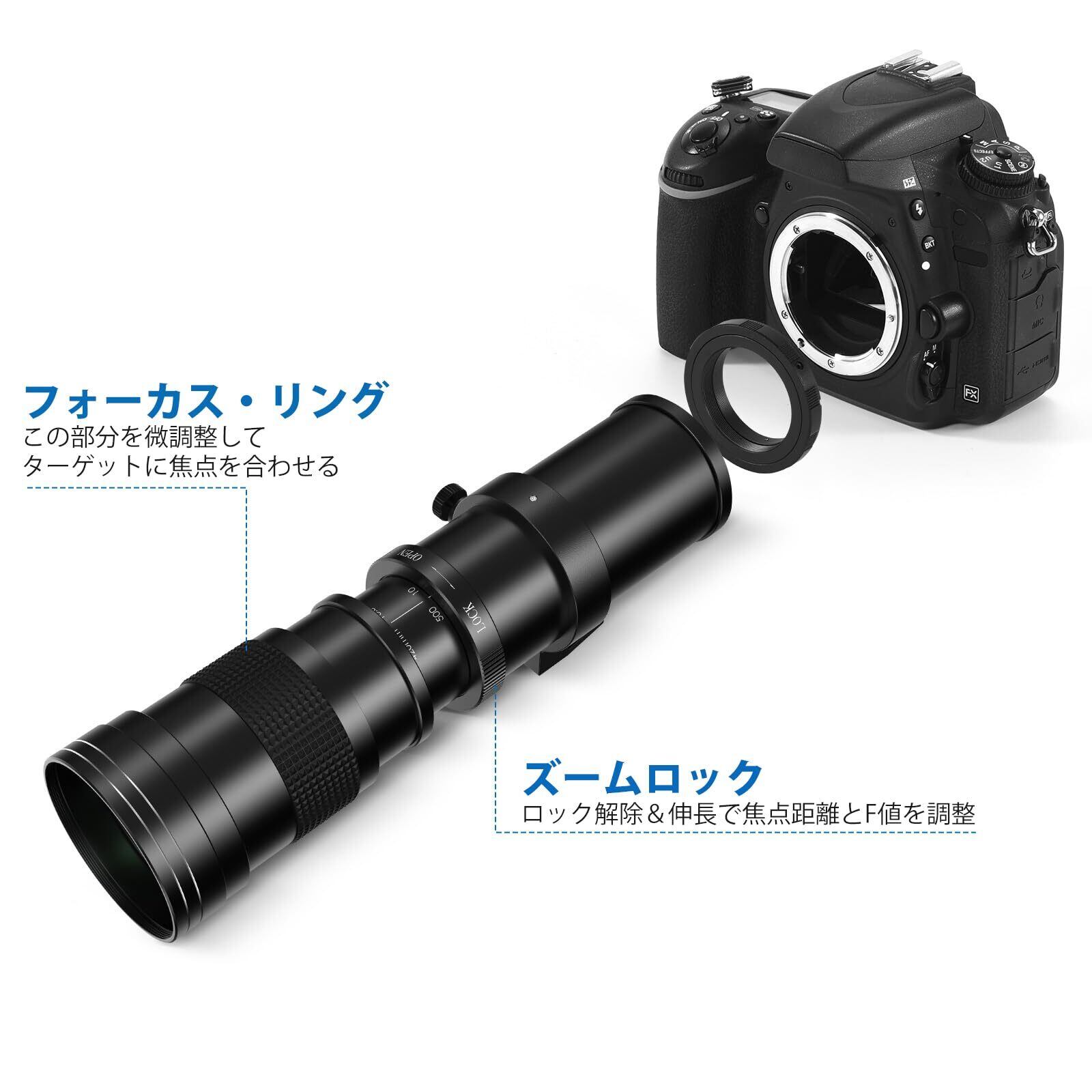 【幅広い用途&部品です】この超望遠ズームレンズは、野鳥、野生動物、風景、飛行機のような小さくて遠くの被写体など、野生動物や自然の撮影に最適。スポーツ撮影には適さない。パッケージ内容:レンズ、日本語マニュアル、レンズクリーニングクロス、接続リング、パッキングバッグ