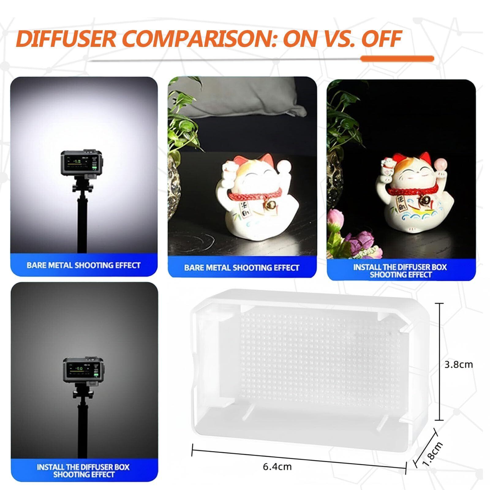 反射の問題を減少:フラッシュライトが直接照射されると反射が発生しやすいですが、ディフューザーを使用すると、顔やその他の部分の光反射を減らし、不自然な明るい斑点を避けることができます。