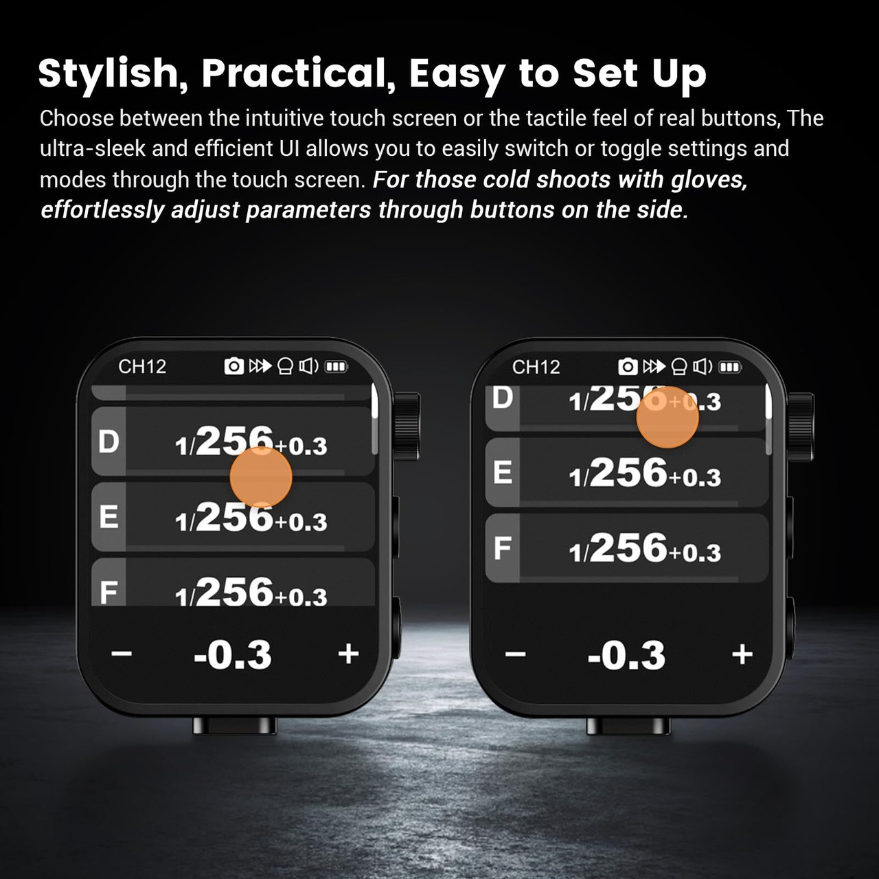 簡単な操作: シンプルなスワイプとタップで、Godox X3O トリガーのインターフェイスを指先で簡単に操作できます。他のGodoxトリガーと同様に、Godox X3O 送信機はTTLおよびマルチフラッシュモードに加え、HSS、先幕同期、後幕同期をサポートしています。直感的なコントロールと多彩なフラッシュモードでワークフローを向上させます。