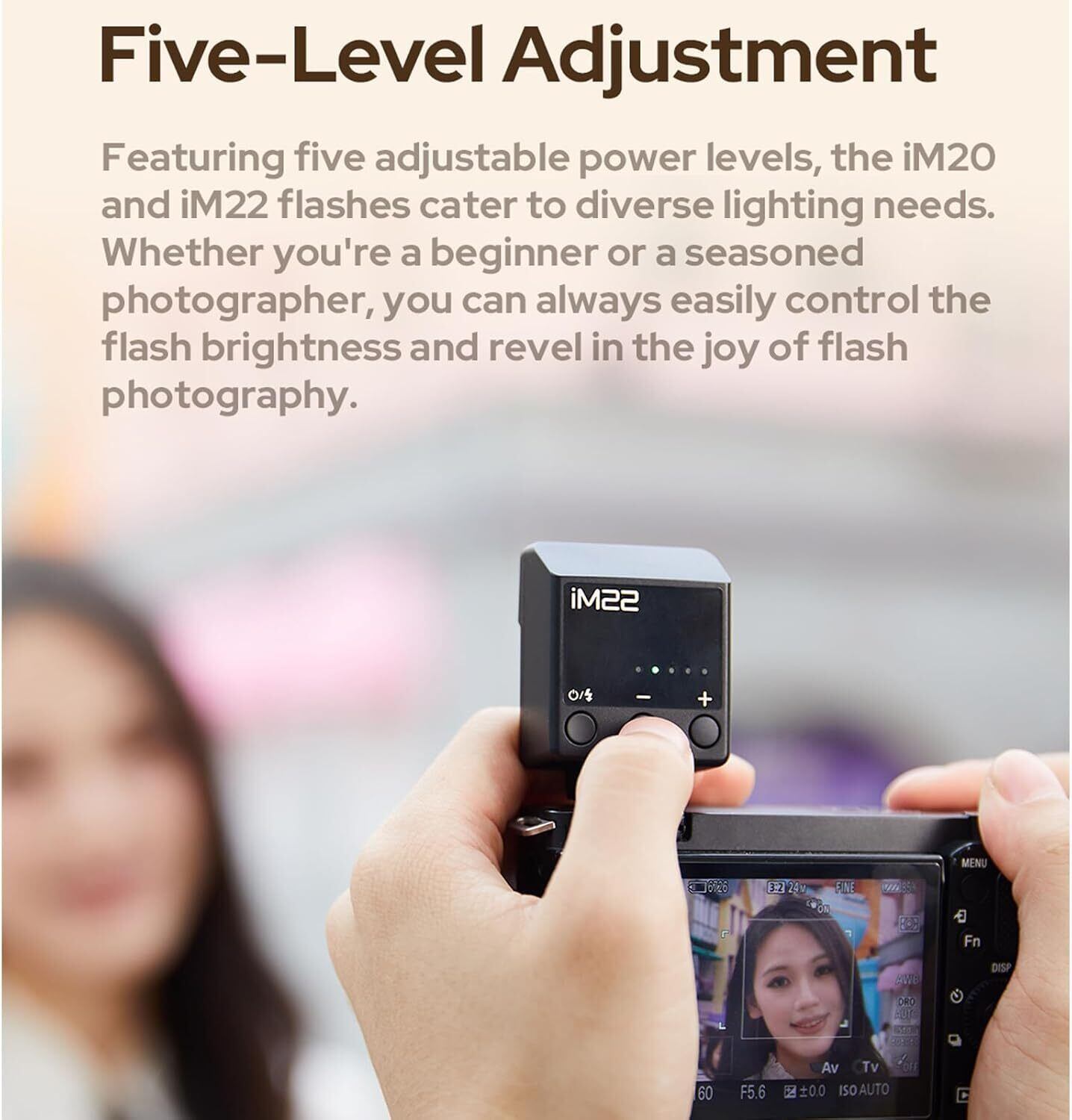 5 段階の調整: iM20 は 5 段階のパワー調整を備えており、撮影環境に応じて調整して、さまざまな補助光要件を満たすことができます。簡単な操作でフラッシュの明るさを調整でき、写真初心者でも簡単に扱えます