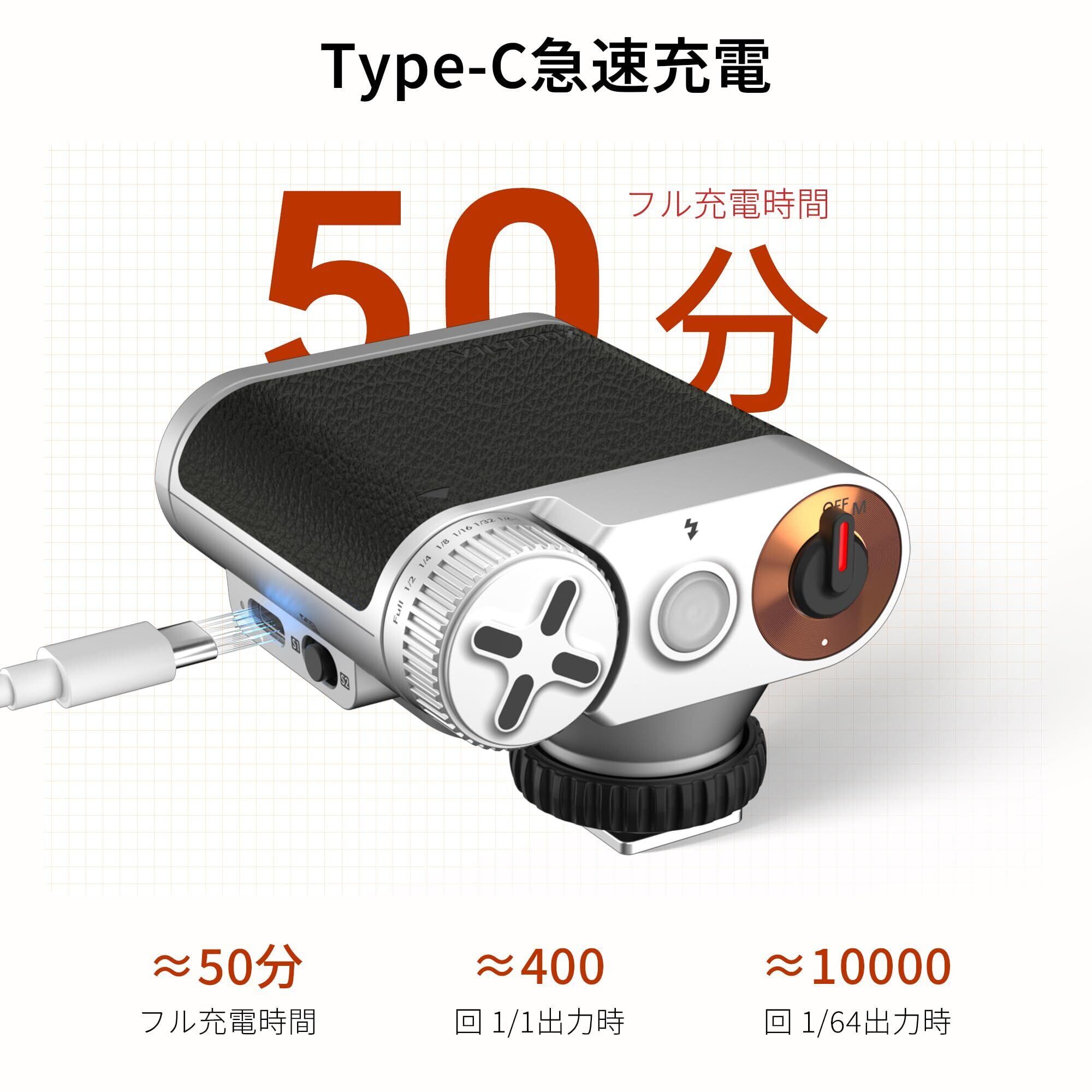 Type-C充電対応で利便性向上:Type-Cポートによる充電に対応し、約50分でフル充電が可能。最大出力(1/1)での発光回数は約400回と、長時間の撮影にも十分対応します。また、使用中の充電にも対応しており、撮影の中断を最小限に抑えます。約15分間操作がないと自動でスリープモードに移行します。再度ご使用の際は、電源を入れ直してください。