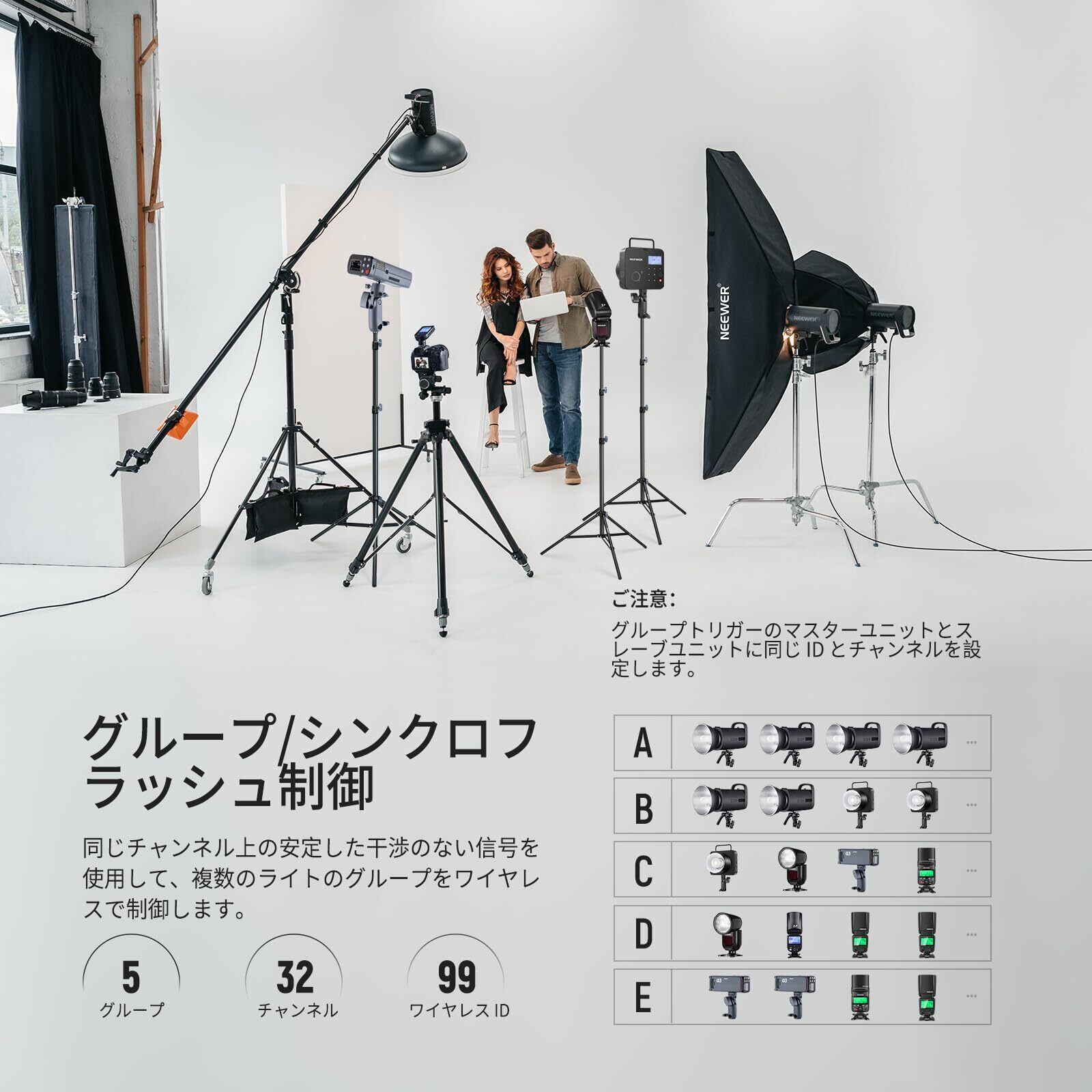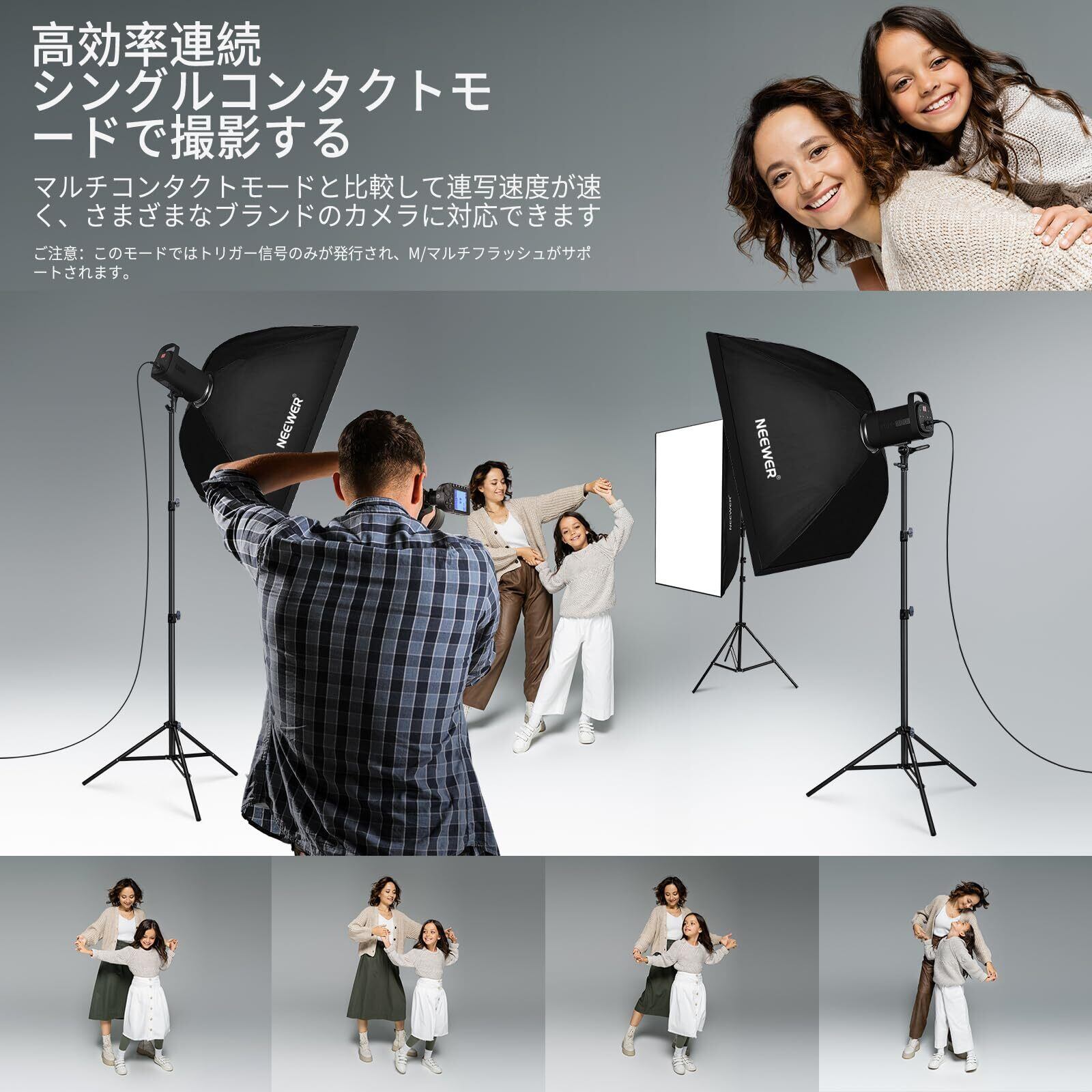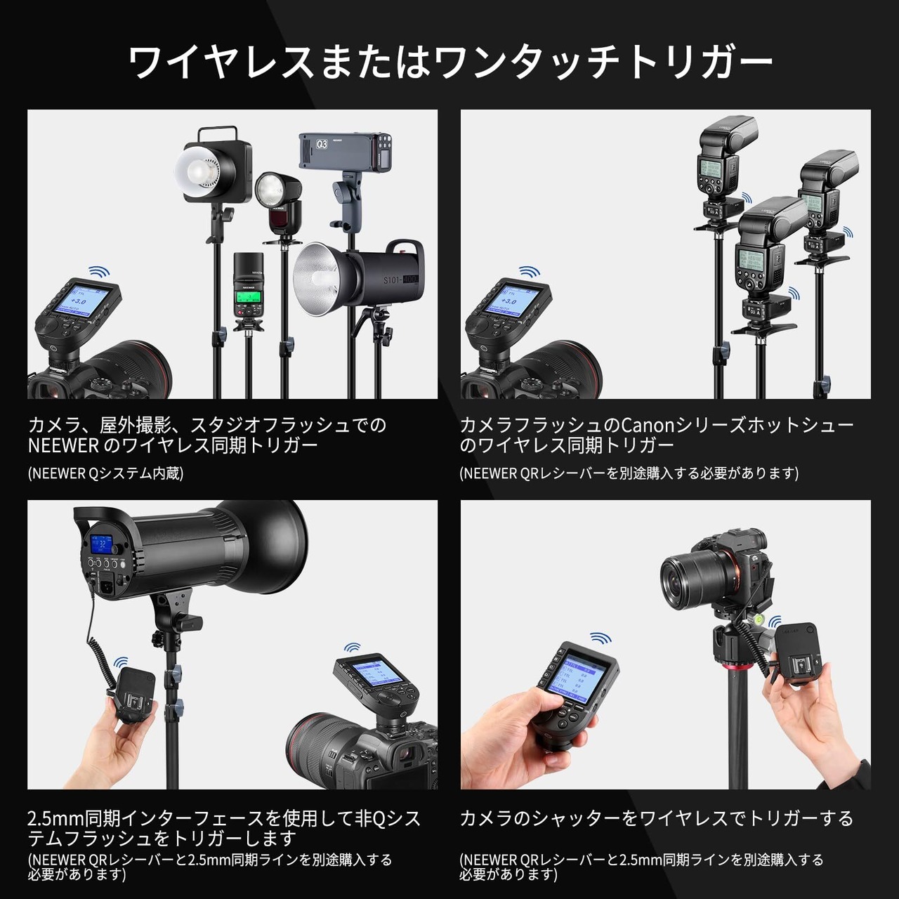 【2.4GワイヤレスQシステム内蔵】内蔵のNEEWERワイヤレスQシステムにより、Q4 Q3 Z1-C Z760-C NW420-C NW655-C NW665-C S101-300W/400W PROをワイヤレスでトリガーし、NEEWER QR レシーバーと2.5mm同期コード(すべて別売り)を使用して、Qシステムを使用せずに他のフラッシュを制御することもできます。また、2.4GHzの安定した接続を介して、最大5グループ、32チャンネル、01-99 ID設定のフラッシュをリモートコントロールし、すべてを同じチャンネルとID設定に設定して、信号の妨害なしにトリガーできます。