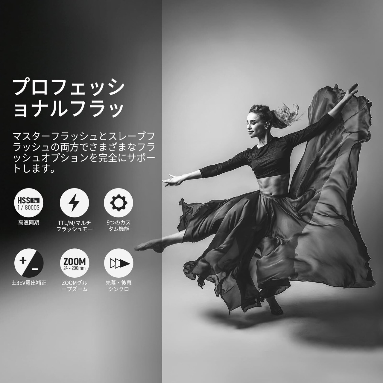 【シングルポイントトリガー】MENUボタンからC.Fn SHOOTと入力すると、カメラに取り付けられたトリガーでシングルポイントトリガーが開始され、高速連続撮影を実現します。ご注意: M/Multiモードではトリガーのみが点滅し、パラメータ調整用ではありません。1/8000秒の高速同期により、シャッタースピードが速くなり、動きの速い被写体に最適です。また、薄暗い場所でカメラの焦点が合わないときに自動的に点灯するフォーカスアシストライトをサポートします。