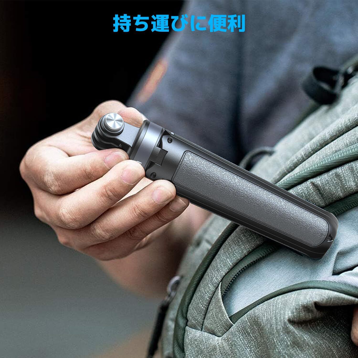 【軽量&コンパクト】全高は260mmで、縮長は136mm、折りたたむと筒状に小さく収納できるので、旅行用としても活躍します。小型の自撮り棒としても使います。手持ち動画を撮影する際に移動しながら手ブレを軽減できるハンドグリップとしても重宝します。重さ約80gと小型軽量なので、アクションカメラと一緒にバッグなどに入れて簡単に持ち運びできます。