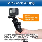 GoPro用マウントが付属。アングル調整がしやすく固定力が高い台座と、しっかり握れるグリップにより、激しい動きの撮影にも対応するアクショングリップとして使用可能。