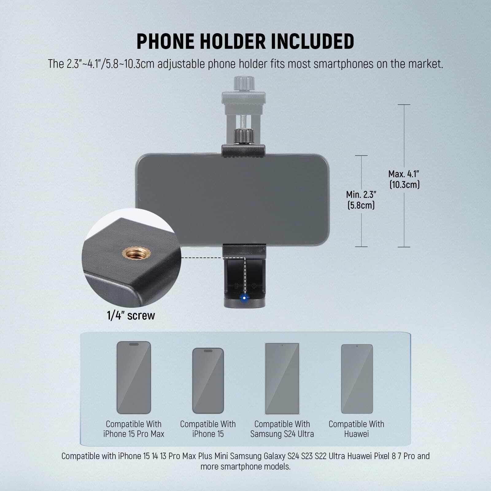 【スマホホルダー付属】幅2.3"-4.1"/5.8-10.3cmのスマホホルダーは、コンパチブル iPhone 16 15 14 13 Pro Max Plus、Galaxy S24 S23 S22 Ultra、Google Pixel 9 8 7 Proなどのスマホモデル、自撮り、写真撮影、vlog、ビデオ録画、生放送などに最適です。