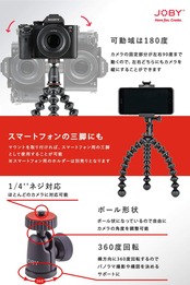 使い方自由自在のゴリラポッド三脚 ■「握る、立てる、巻き付ける」 状況に応じて色々な撮影が楽しめます。 ■脚を自由に折り曲げられるため、通常の三脚は立てることができない意外な場所や、機材のバランスを保てない難しい角度でも、工夫次第で機材を固定することができ、自撮りでもユニークなアングルからの撮影が可能になります。