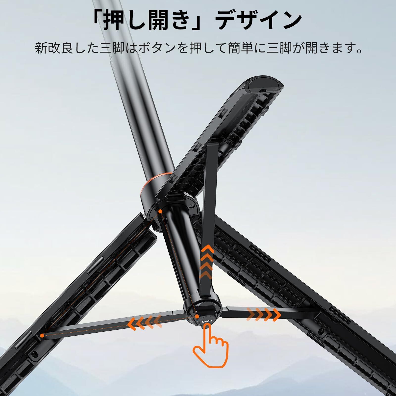 「使用方法(Push)デザイン」三脚の底に新しいデザインの「PUSH」ボタンがあり、押すと三脚が素早く開きます。使用しないときは簡単にロックすることができます。ご注意:三脚を開閉、伸縮、取付などすること、力を入れすぎないようにご注意ください。