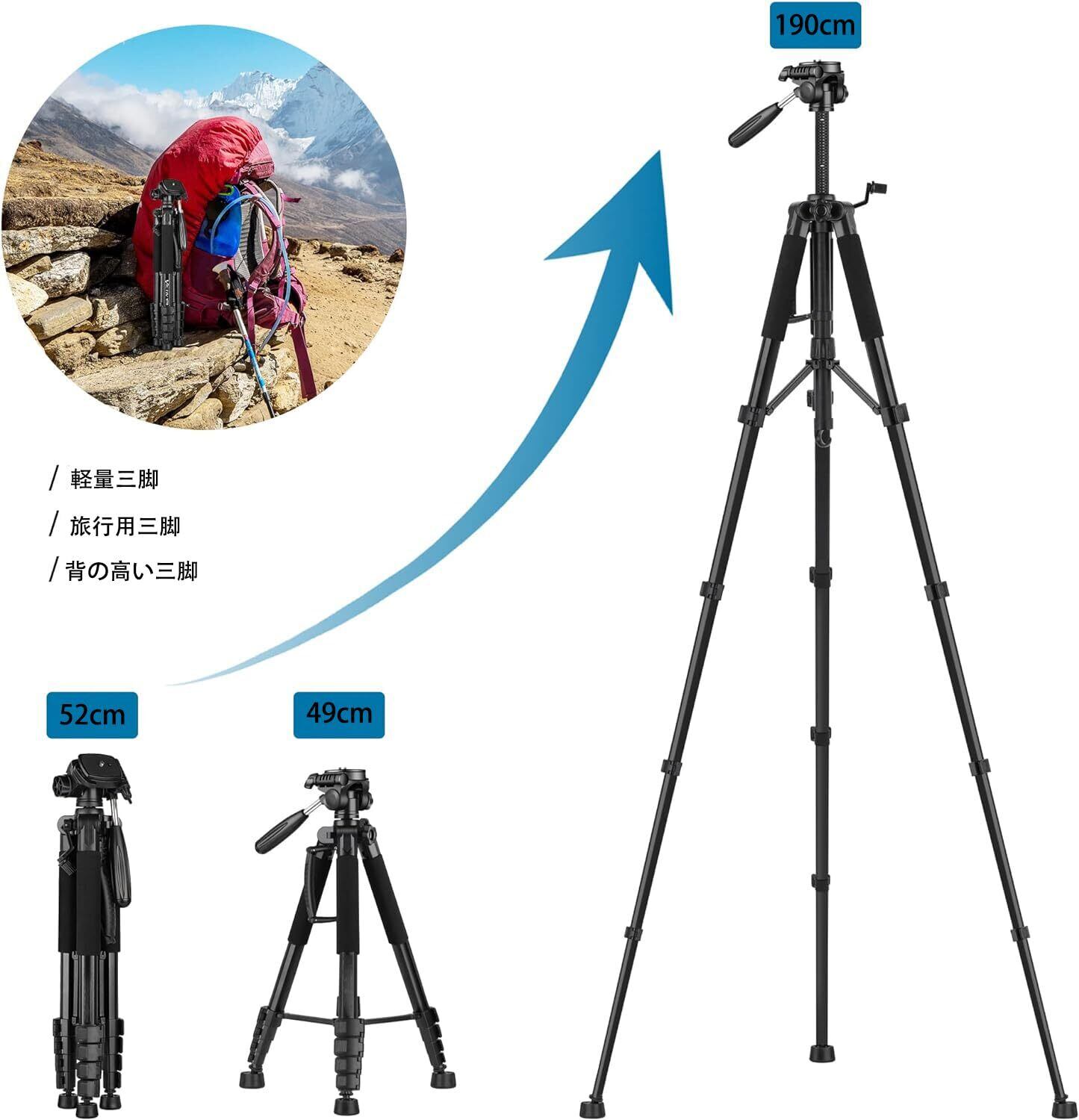 ■【高身長でダイナミックな撮影を!】最大190cmまで高さを調整できるこの三脚は、広角風景や立ったままでの撮影に最適です。高い位置から撮影することで、臨場感あふれる映像を生み出します。