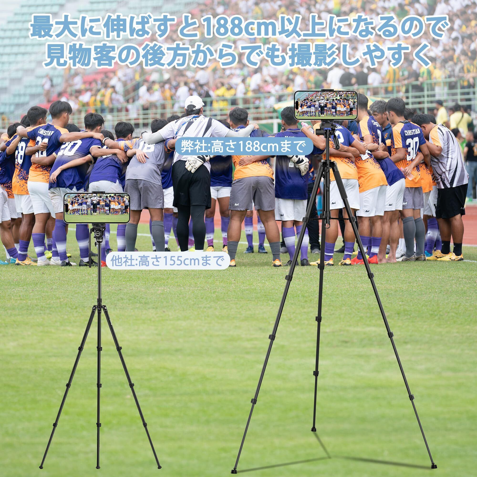■【全高188cmの高い伸縮性!】ZOCUSの三脚は、最大188cmまで伸びるため、さまざまな撮影ニーズに対応。特に高い視点からの撮影や広角ショットに最適で、風景やプロモーション映像など多岐にわたるシーンで活躍します。