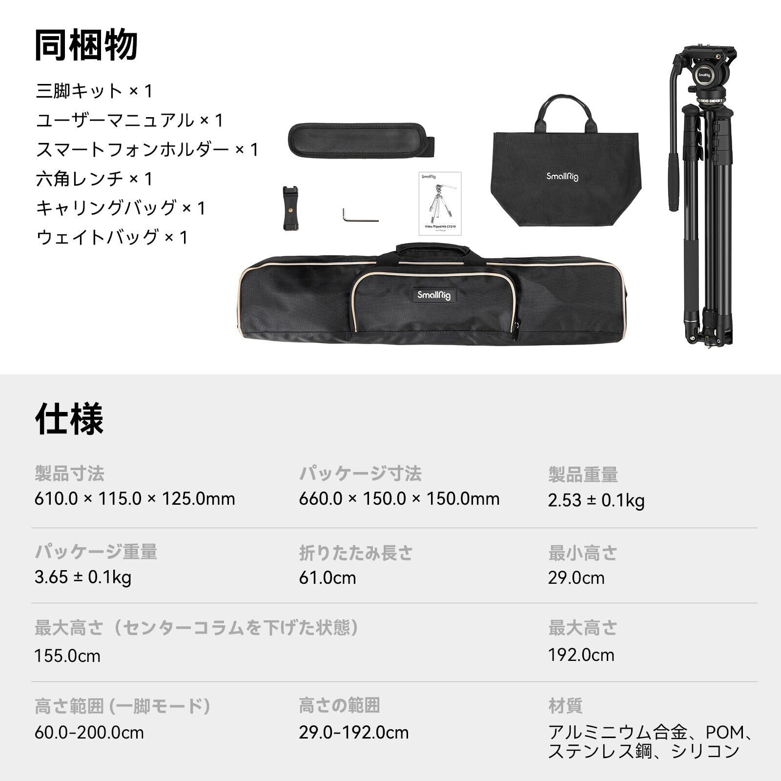 【数量限定】SmallRig ビデオ三脚 CT210 レベリングベース付三脚 ビデオ雲台セット 3脚高さ192cmまで 耐荷重6kg カメラ用三脚 一脚高さ200まで DSLR アルミ合金製 RS 2/RS 3/RS 3 Proクイックリリースプレートとマンフロットクイックリリースプレート対応 一眼レフカメラ対応 ビデオカメラ対応 収納バッグ&ウェイトバッグ付 中心軸反転 一脚可変式 スモールリグ 4475