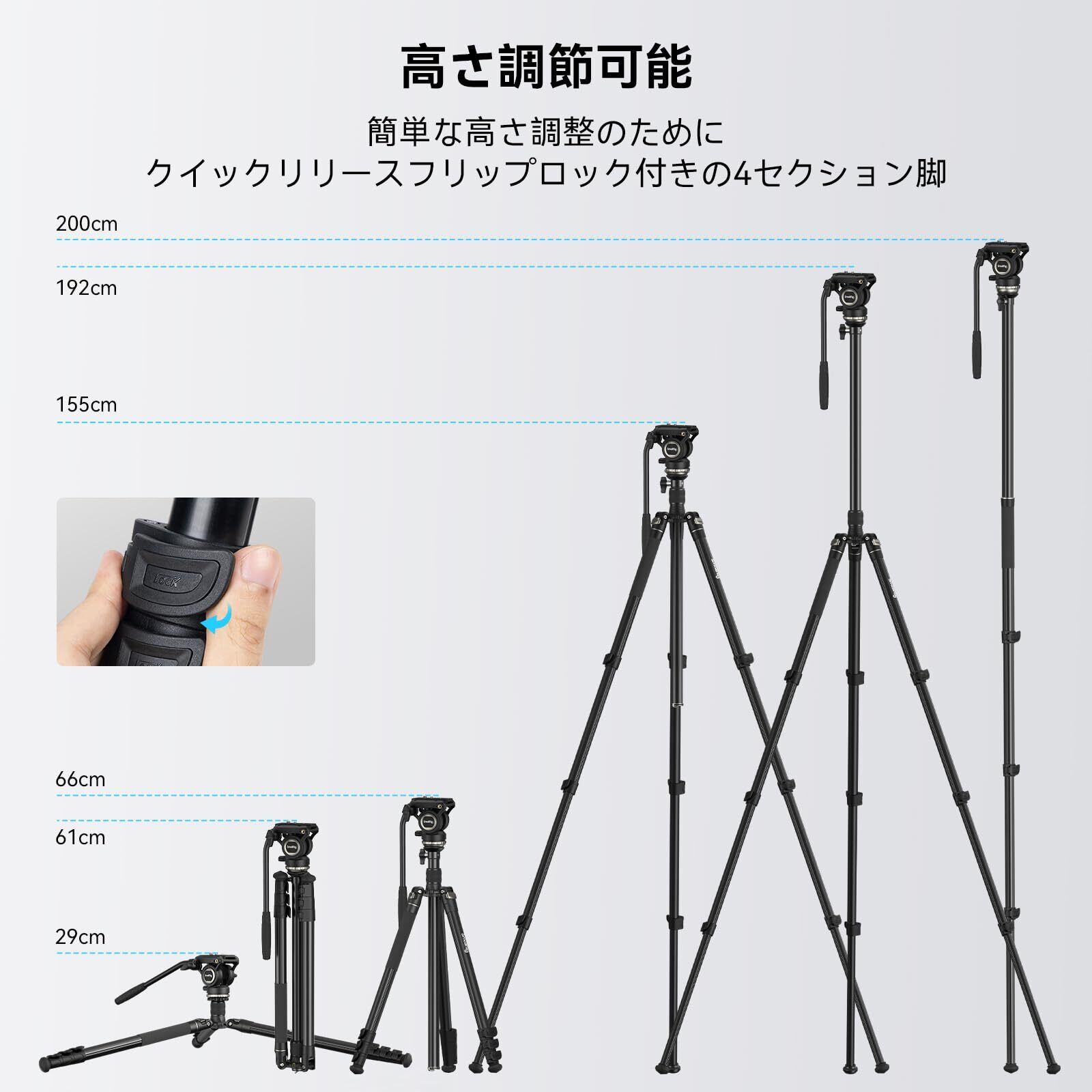 ■【一脚への簡単変形!】一脚としても使用でき、高さは最大200cmまで調整可能です。多様な撮影スタイルに対応し、特に狭い場所や低いアングルでの撮影に便利です。瞬時に形を変えることができ、あらゆる状況に柔軟に対応します。