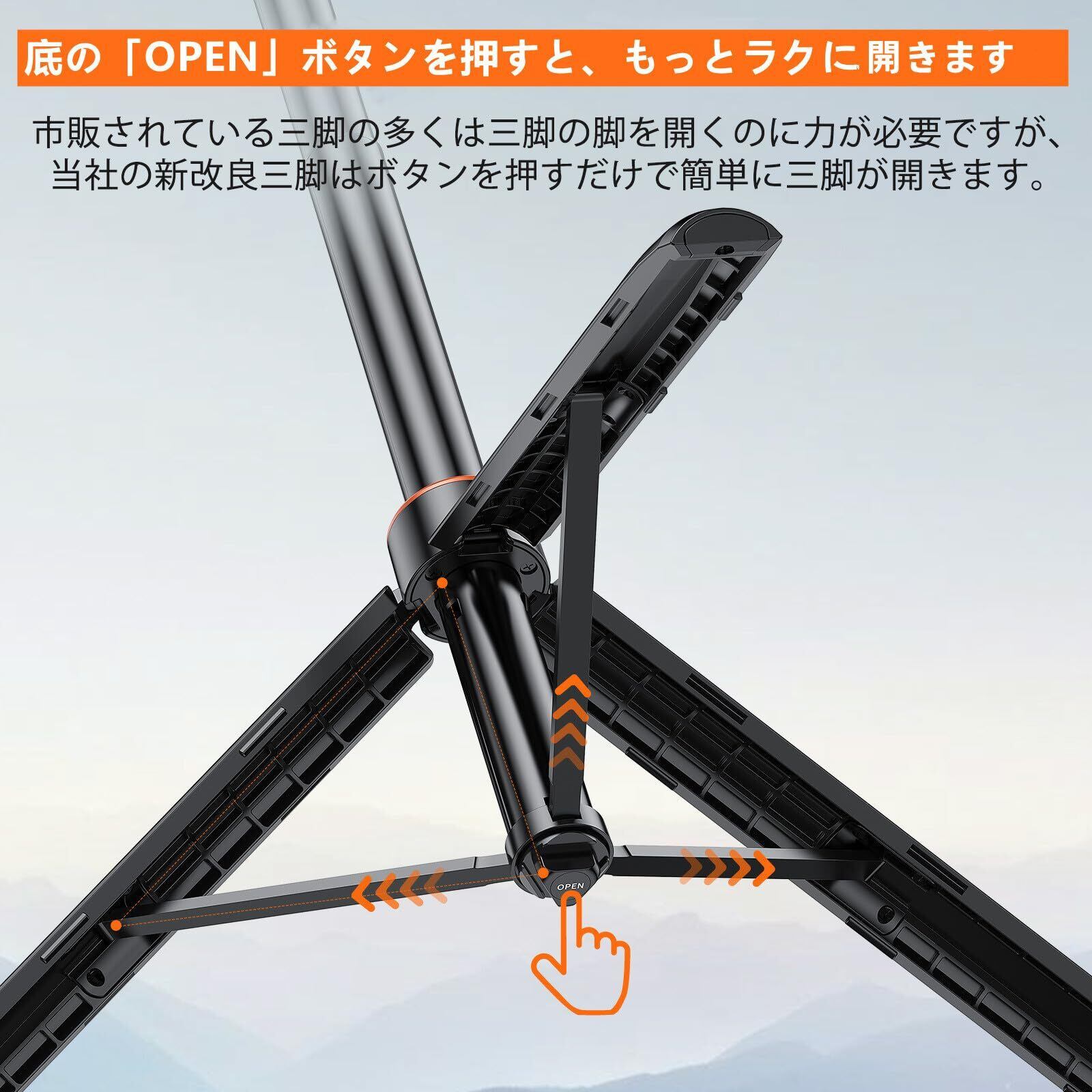 【プロ級の安定性】自撮り棒のホルダー部分と三脚の足元には滑り止めゴムを採用し、安定した設置が可能です。高品質なアルミ合金と ABS 樹脂を使用しており、長期間の使用にも耐えられます。さらに、スタンド底面には 3 つのブラケットを追加し、三脚展開時の安定性を一層高めました