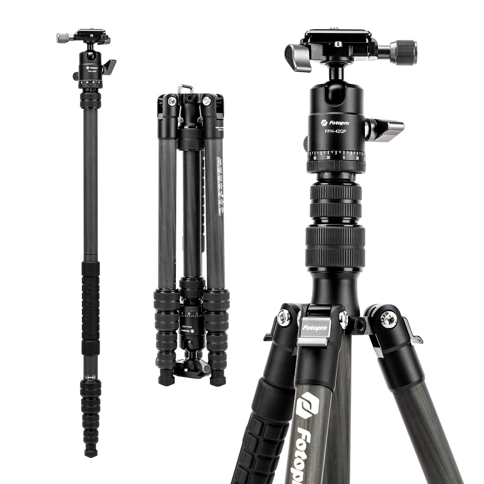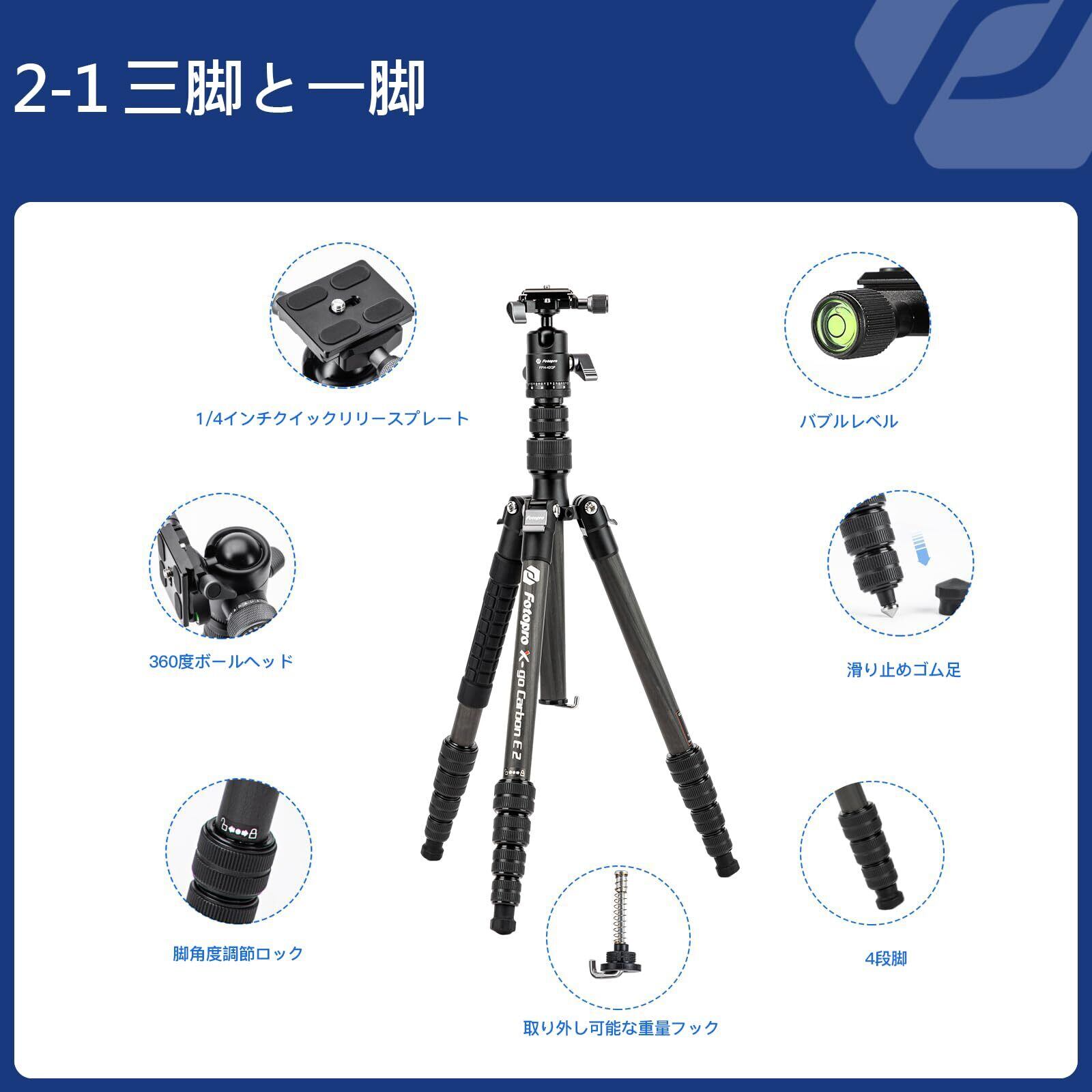 Fotopro 152CM カーボンファイバー製 旅行用三脚架 コンパクト カメラ三脚架 ボールヘッド付き クイックリリースプレート DSLR/ミラーレス対応 モノポッド変換可能 収納バッグ付属 最大荷重8KG X-go E2 黒