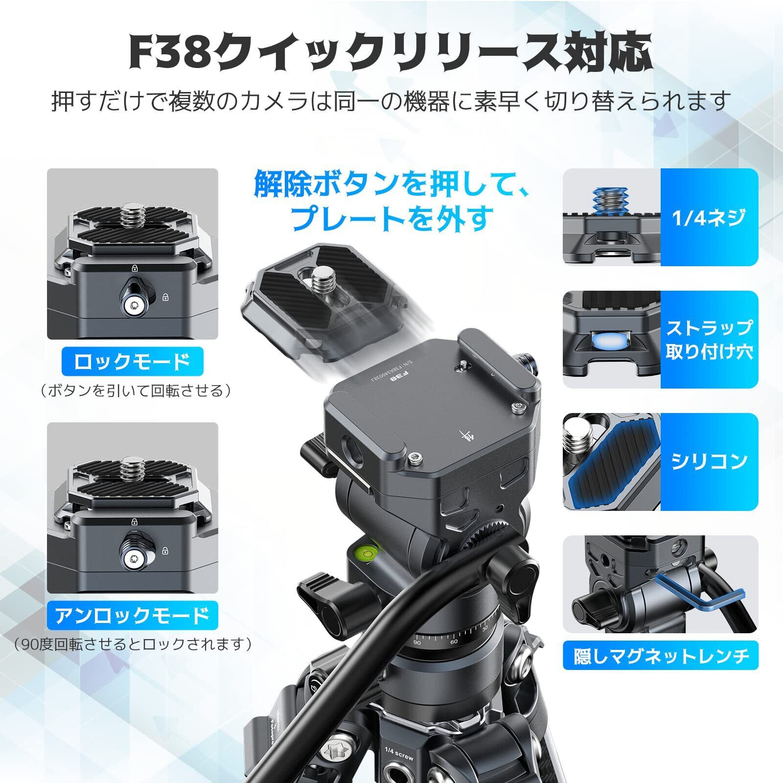 【F38 クイックリリース適用】三脚はF38クイックリリースプレートを付き、複数のカメラは同一の機器に素早く切り替えられます。またはカメラを複数の機器に素早く切り替えられるので、手間が省けてとても便利です。 プレートの上部には滑り止めのゴムがあり、ずれを防ぐと同時にカメラを保護することができます。上部には1/4インチネジがあります。注意:F38の台座は取り外しができません。