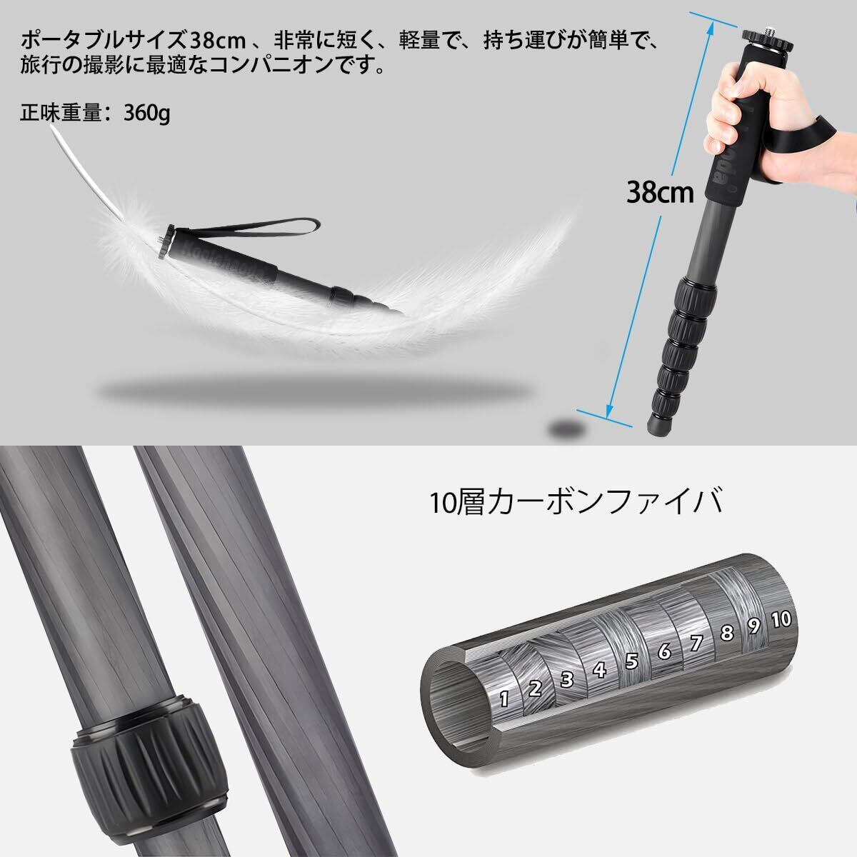 Koolehaoda 一脚カーボンファイバー製カメラ用旅行一脚 耐荷重10kg脚径28mm 6段階伸縮 収納高38cm コンパクト 便利 軽量 旅行用 (MP-286C)