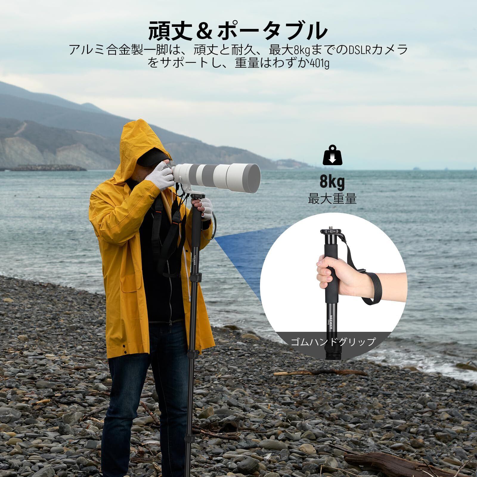 【頑丈&ポータブル】アルミ合金製カメラ一脚は頑丈で、8kgまでのDSLRカメラをサポートします。重量はわずか401gで、コンパクトな17.3"/44cmに折りたたむことができ、持ち運びに非常に便利です。リストストラップとゴム製ハンドグリップは外出先での持ち運びに便利です。