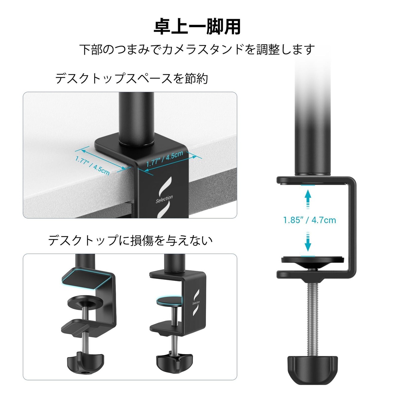 【ランプスタンド用】下部のつまみでカメラスタンドを調整します。これは、さまざまなテーブルに適しており、最大6cmの厚さのテーブルに適しており、ランプ三脚よりもスペースを節約できます。