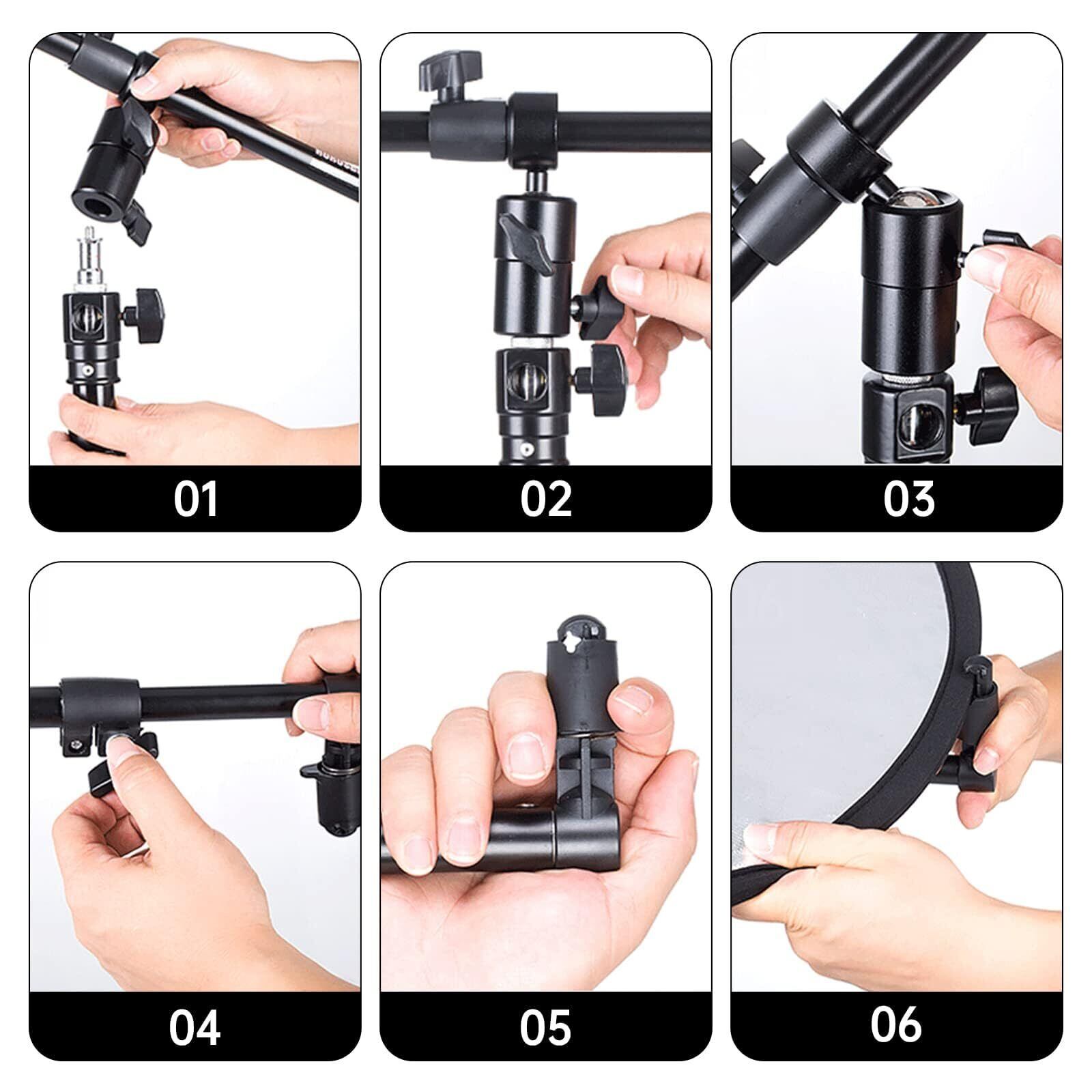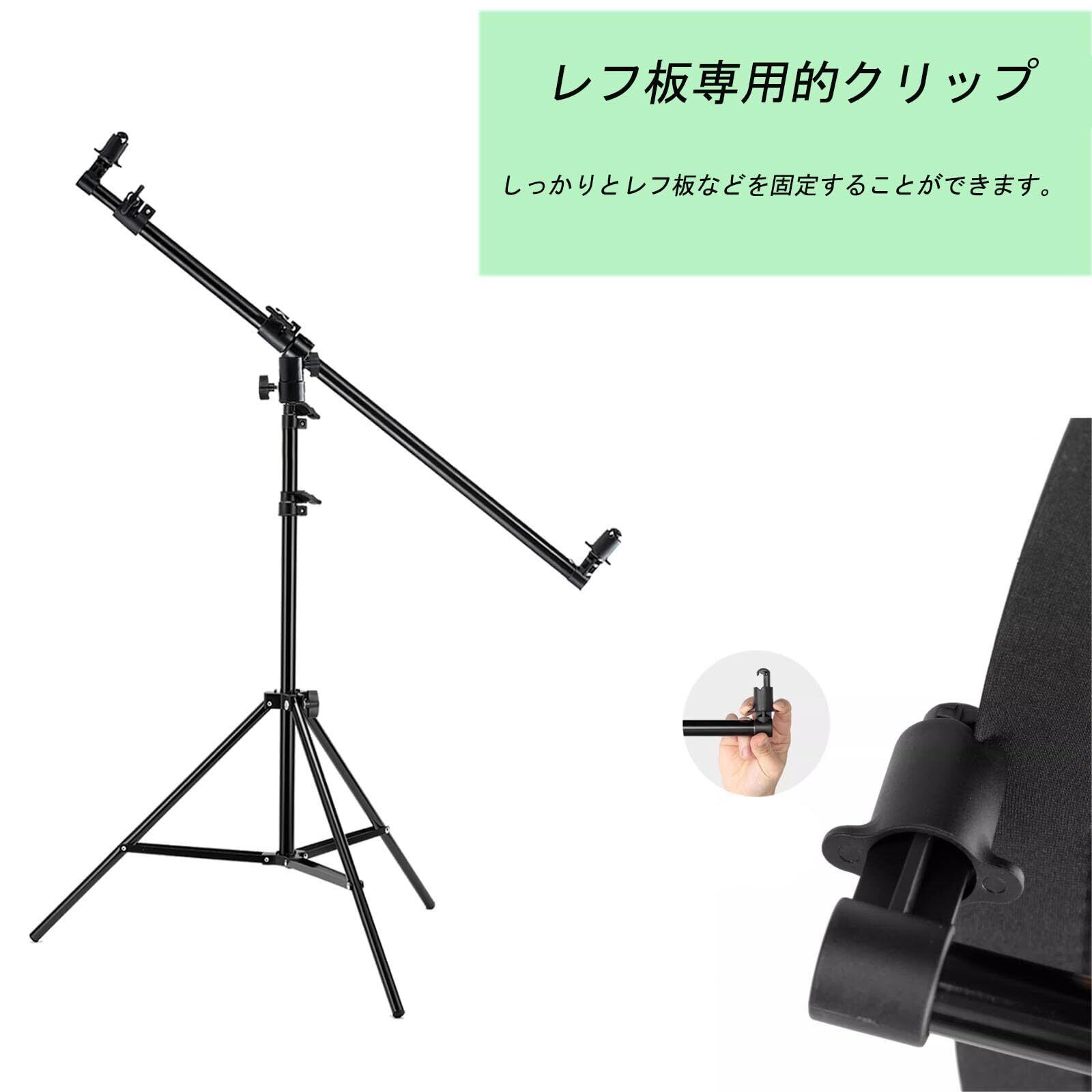 【便利なリフレクターホルダー】さまざまなサイズのリフレクターを収納できるように設計されています。伸縮可能なリフレクターホルダーアームの両端には、リフレクターをしっかりと取り付けるための2つのブラケットクリップが付いています。フォトスタジオとアウトドア撮影の両方の必需品です。