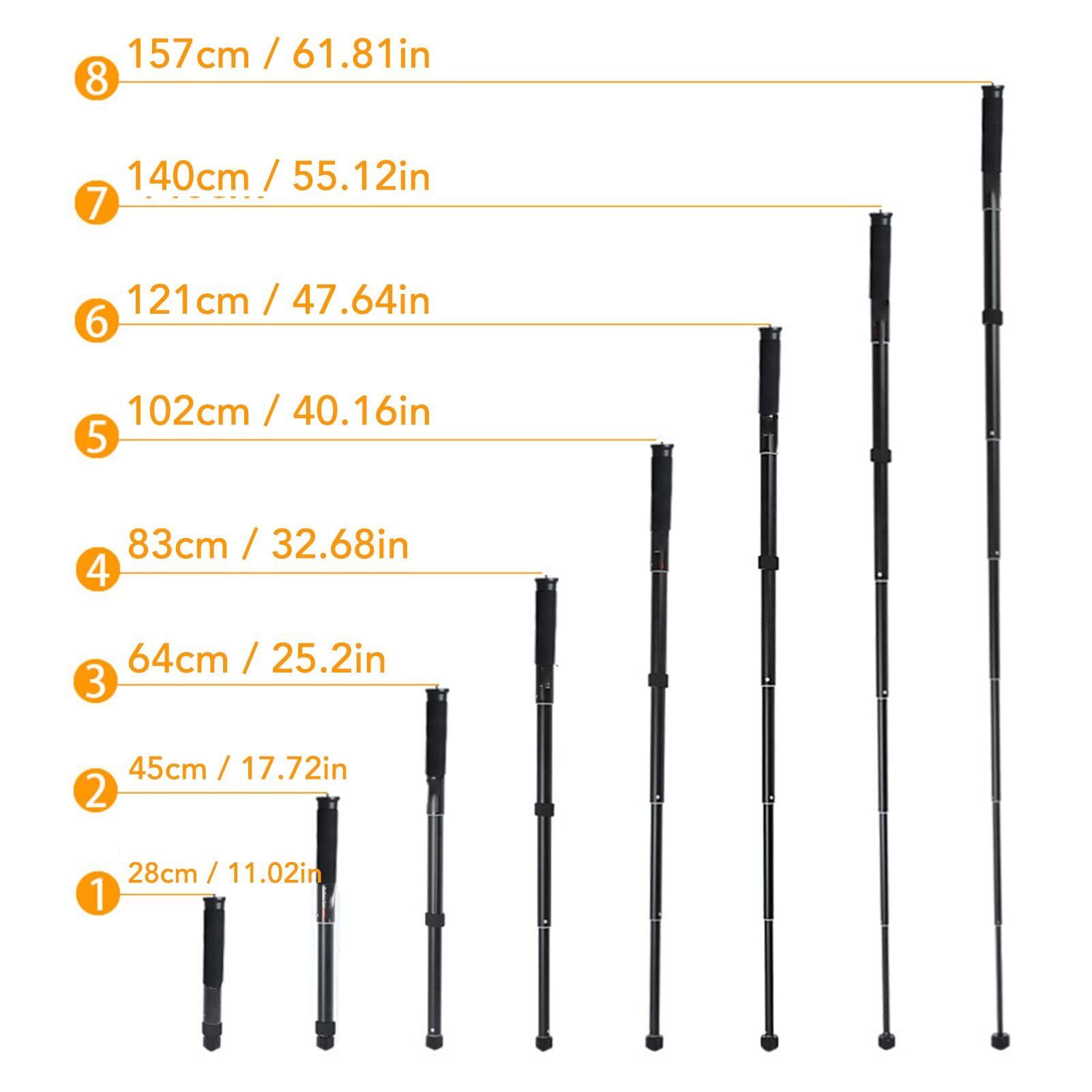 柔軟な延長:ノブ調整をサポートし、カメラ一脚を28cmから157cmまで延長して、自撮り棒、トレッキングポールなどとして使用できます。