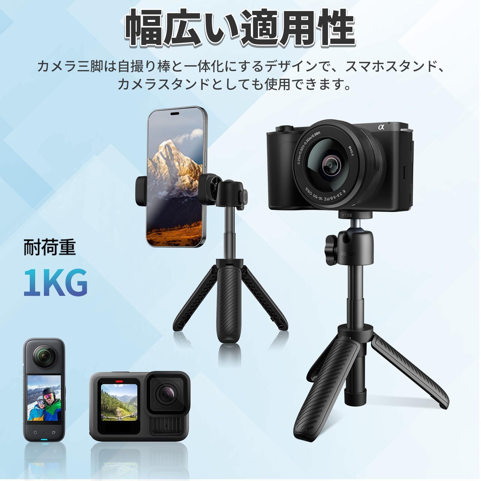 【幅広い適用性】カメラ三脚は自撮り棒と一体化にするデザインで、スマホスタンド、カメラスタンドとしても使用できます。パーティー、写真撮影やvlog、LIVE、ビデオ通話、生放送、旅行、休暇、Web会議などをする時に三脚を使用しますと手が解放されます。1/4ネジ穴が付き、非常に便利な三脚です。